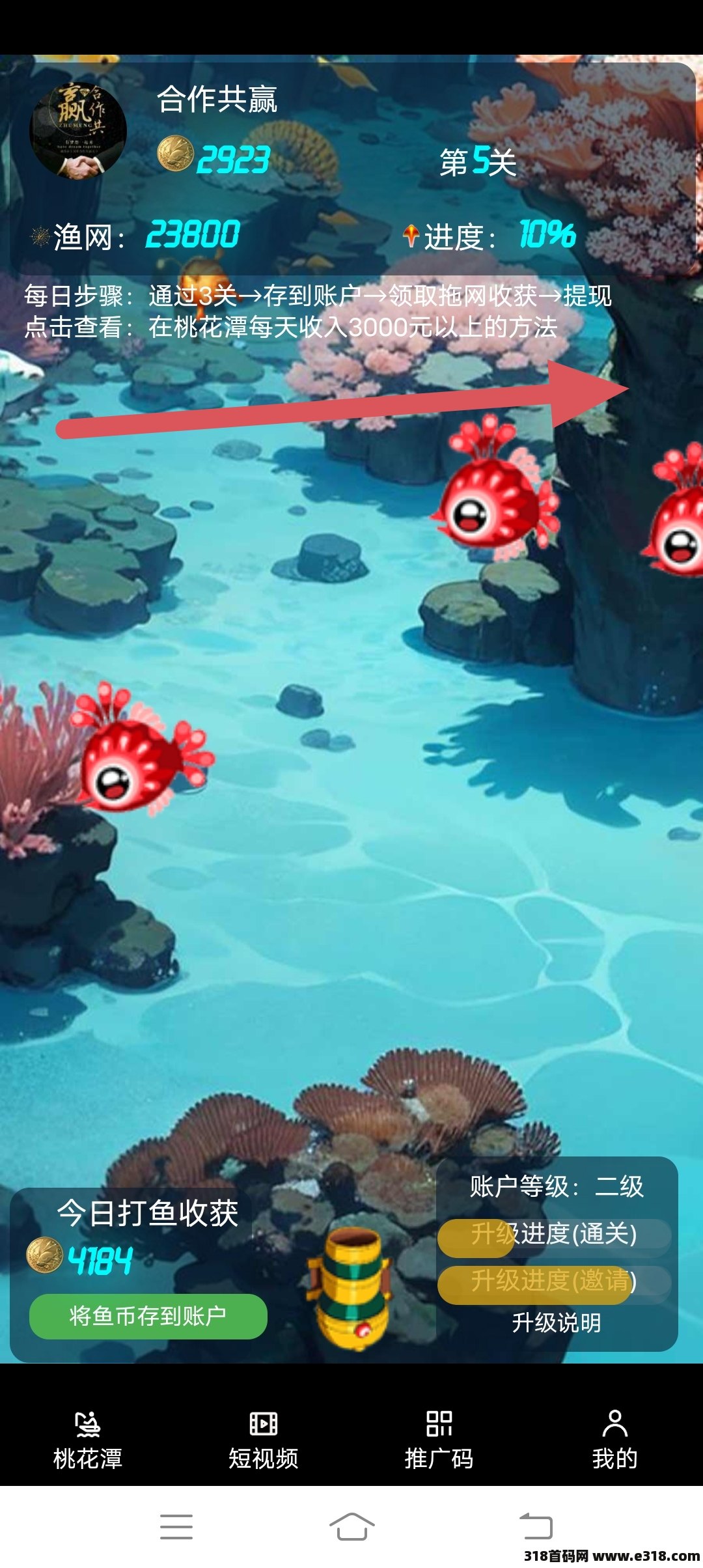 方法二:每天坚持打鱼并通过第6关,让你的推荐人多推荐的新人自动滑落到您的专网中,这样您即使不用邀请好友,也会获得很高的收入。