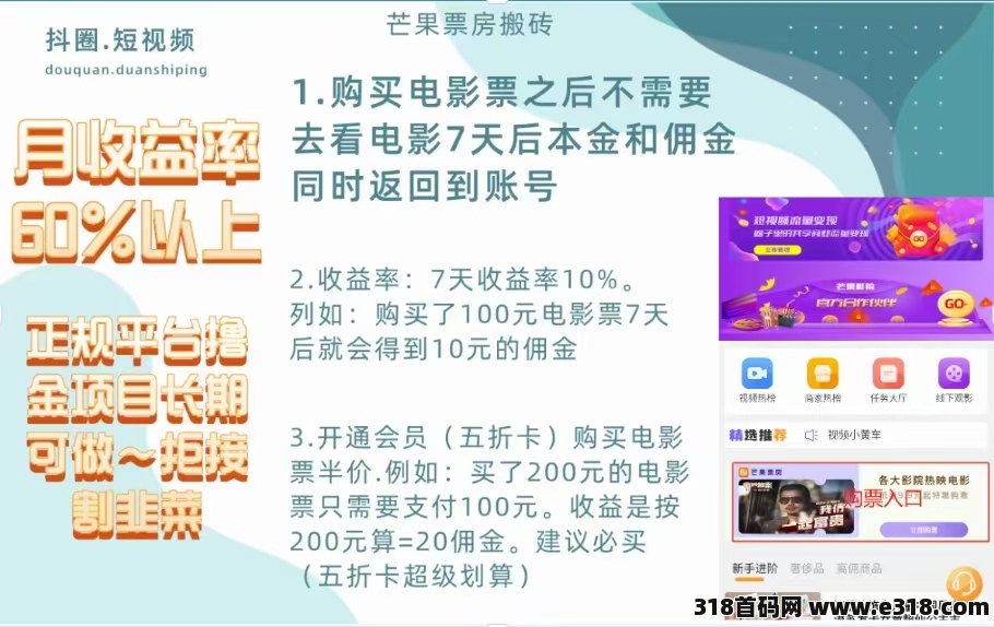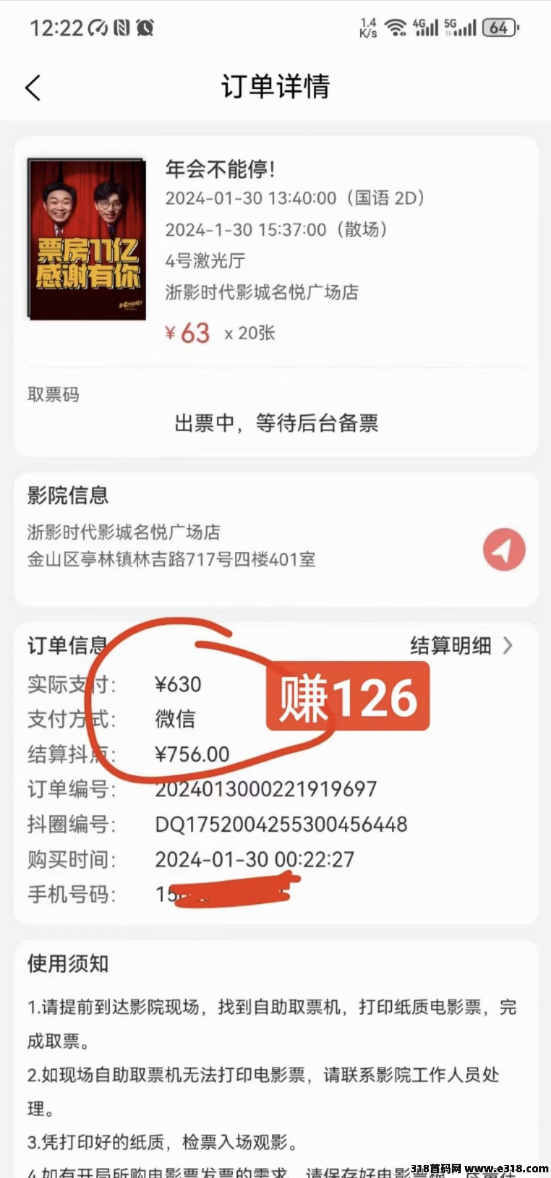 抖圈,购票垫付模式,电影票搬砖,收益稳。