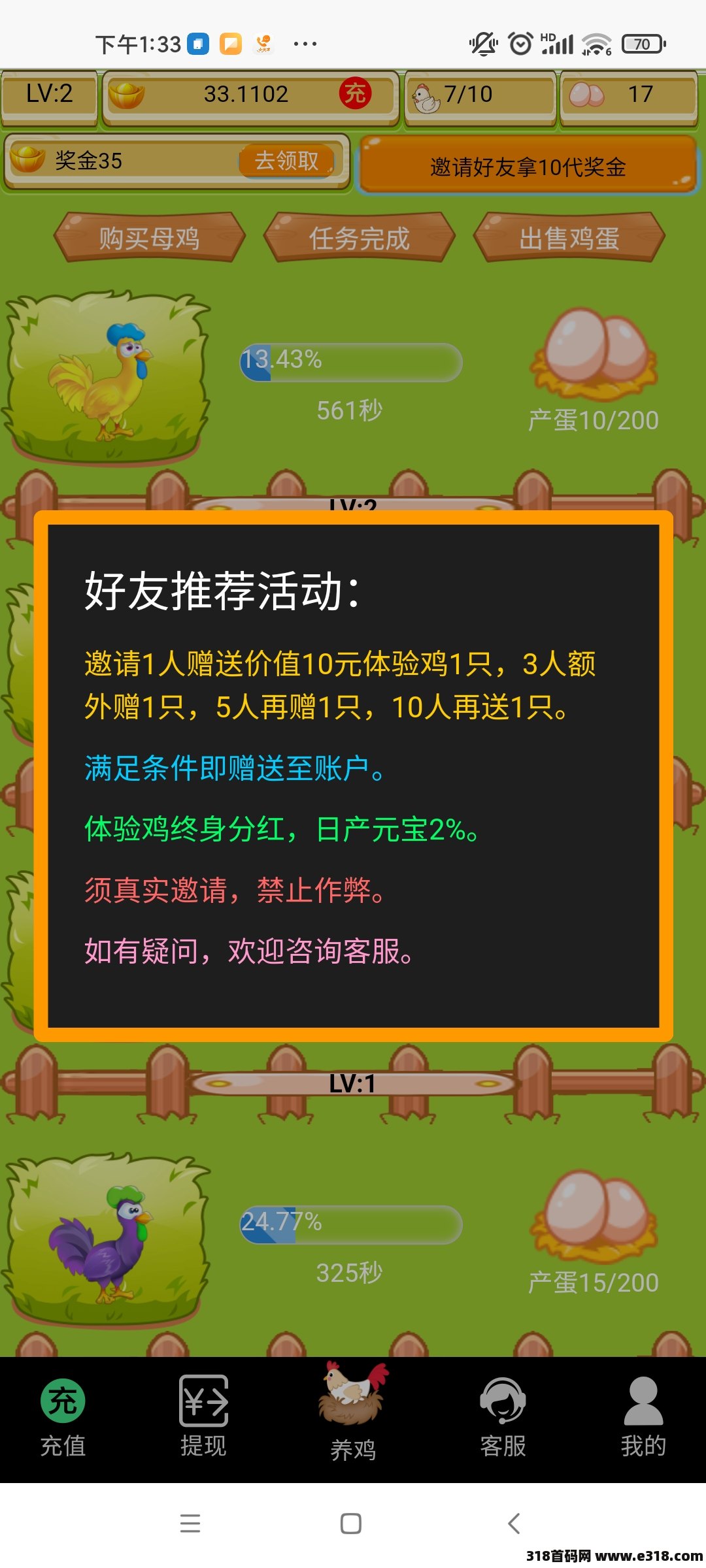 注册送100元宝,买鸡,下蛋,卖鸡蛋再买鸡