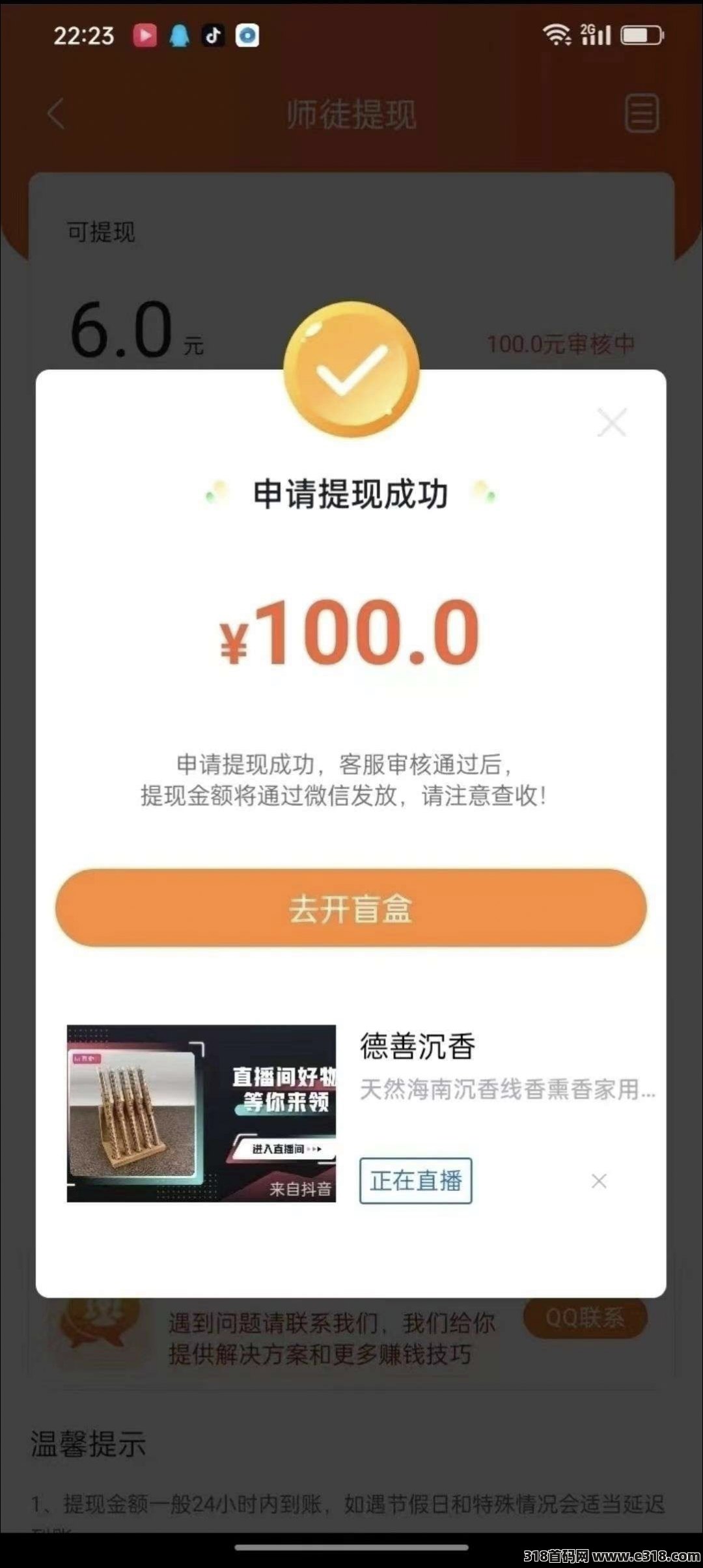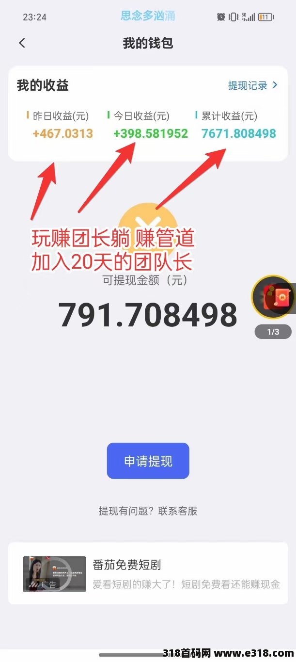 自己看广告赚钱: 每条广告5000金币=0.5元 1条广告30秒, 可以多步手机同时操作, 30*0.5*3=45元 一天用不了1个小时。 推广: 一级:10%佣金提成 团长:**下级10%佣金提成,(你下级下级下级下下级邀请人你也有奖励提成) 手下升级团长,你获得团长提现10%收益(前提你也是团长) 注意事项: 手机要安装淘宝,快手, 抖音, 不能安装黑科技比如分身,虚拟定位,脚本等, 显示设备异常, 那就过一会再来看广告 有问题问app客服也可以加群问管理