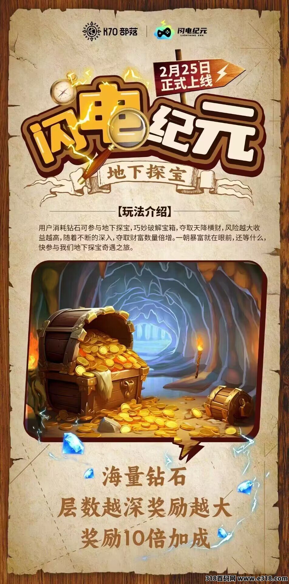 闪电纪元 地下探宝 2月25日正式上线玩法介绍:用户消耗钻石可参与地下探宝,巧妙**宝箱,夺取天降横财,风险越大收益越高,随着不断的深入,夺取财富数量倍增。一朝暴富就在眼前,还等什么,快参与我们地下探宝奇遇之旅。海量钻石 层数越深奖励越大 奖励10倍加成