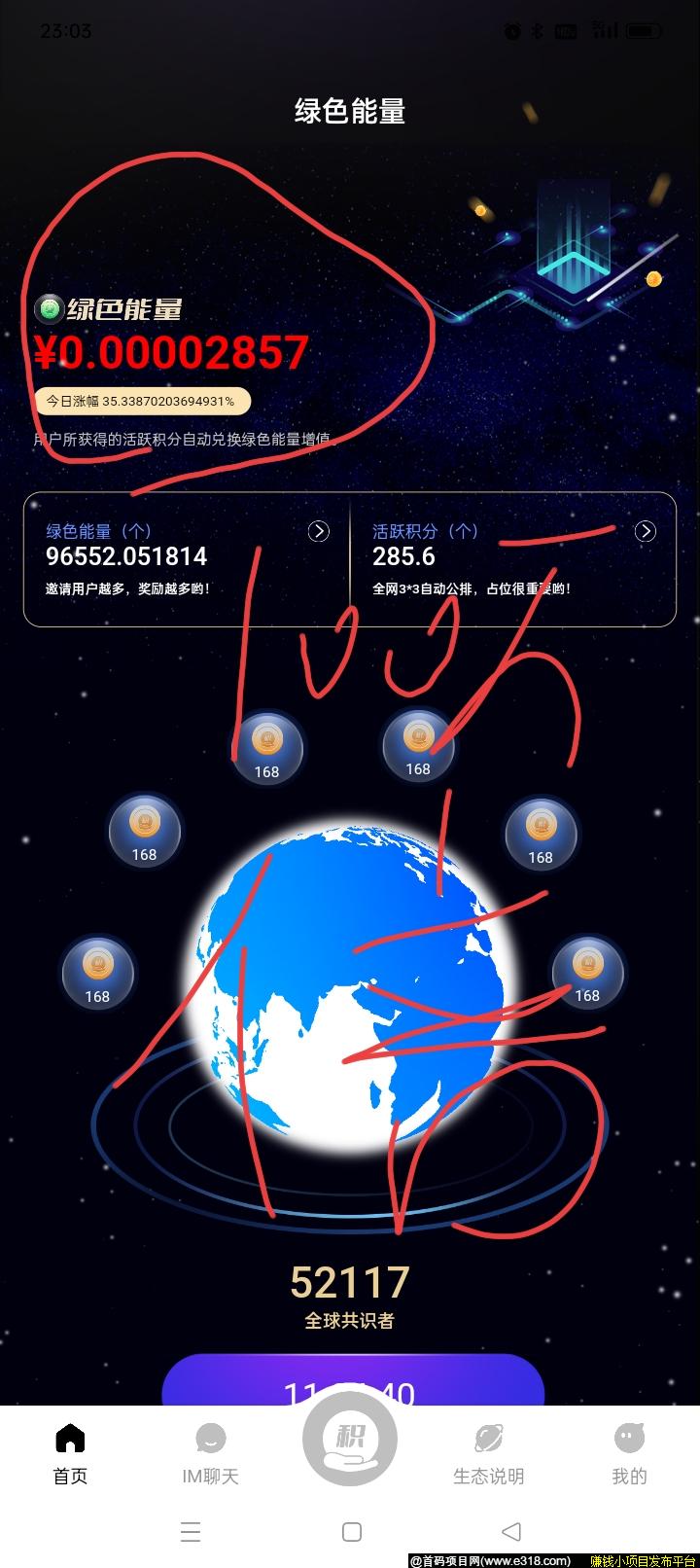 3万人每人每天给你贡献1分钱,一天就是300元,月入9000[强]每人每天贡献1毛钱一天就是3000元,月入 9万,这还不包括你自己点的广告收益和直推团队收益,重点是赚的都是绿色能量,价格在逐渐上涨,有上万倍空间,创始人说一个月就会涨100倍
