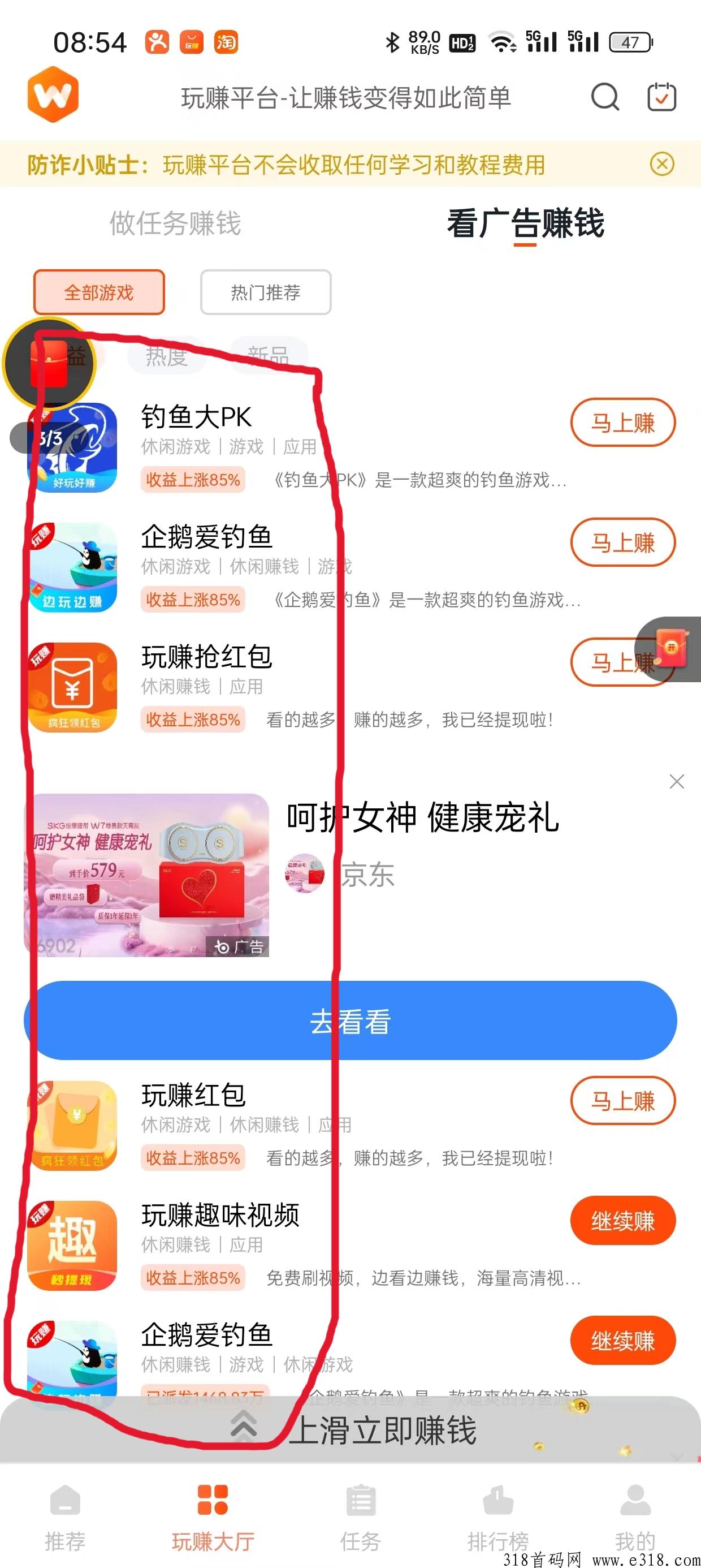 新手都去玩赚大厅里面下载最前面的5款轮着撸米,每一款游戏的广告每天都有上限,所有想 每天撸多一点的,就在玩赚大厅里面多下载几款轮着玩。