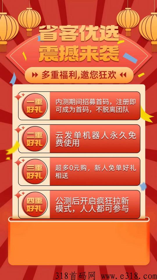 省客优选新人【专享0元购】等你来,日常网购领券再返利,至高可省90%,现在加入立即免费开启高佣、返利、分享赚等高级权限,海量商品【百万补贴】低至1元,每日更新,每天还有很多的折扣商品,买到就是赚到注意:填写省客优选官方邀请码12345直升分公司直接升级最高级别!
