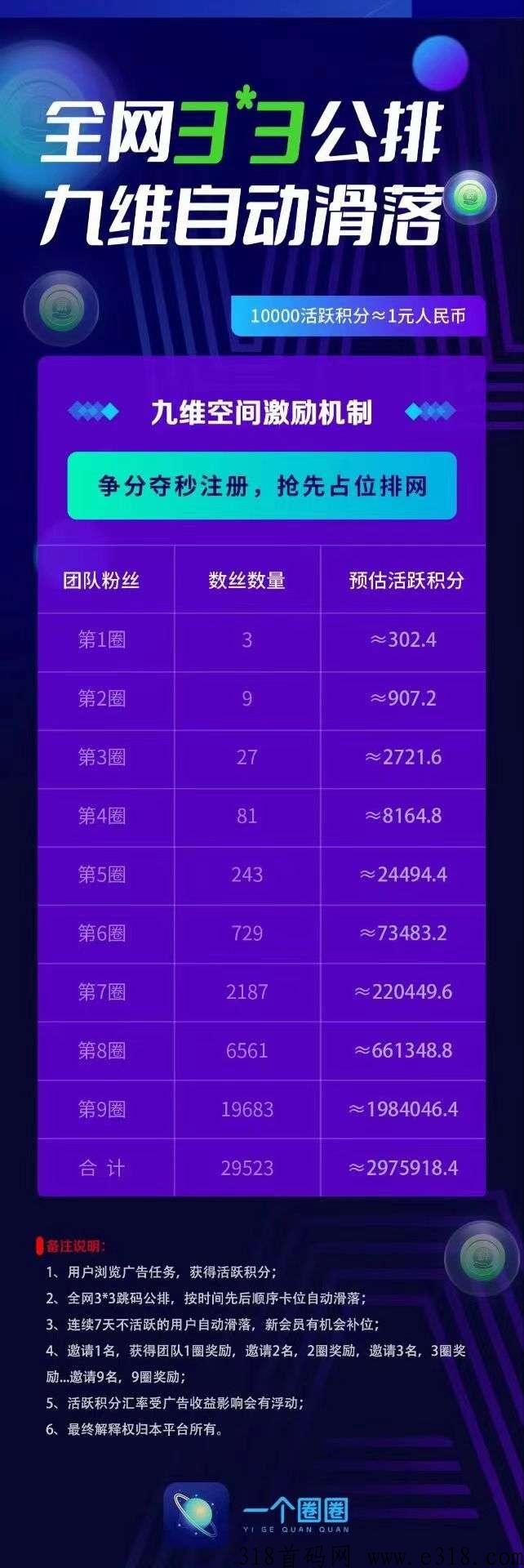 全团队**收益+三三公排九层滑落收益(最多?滑落29523人)早占位早收益。