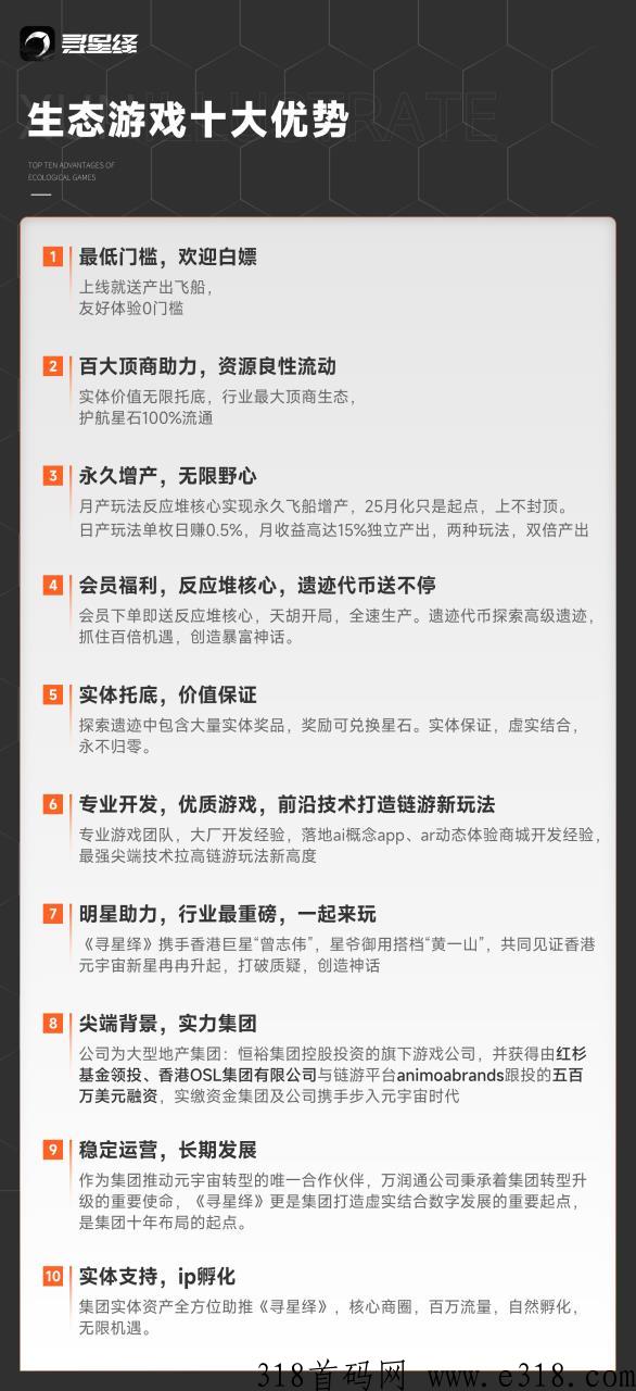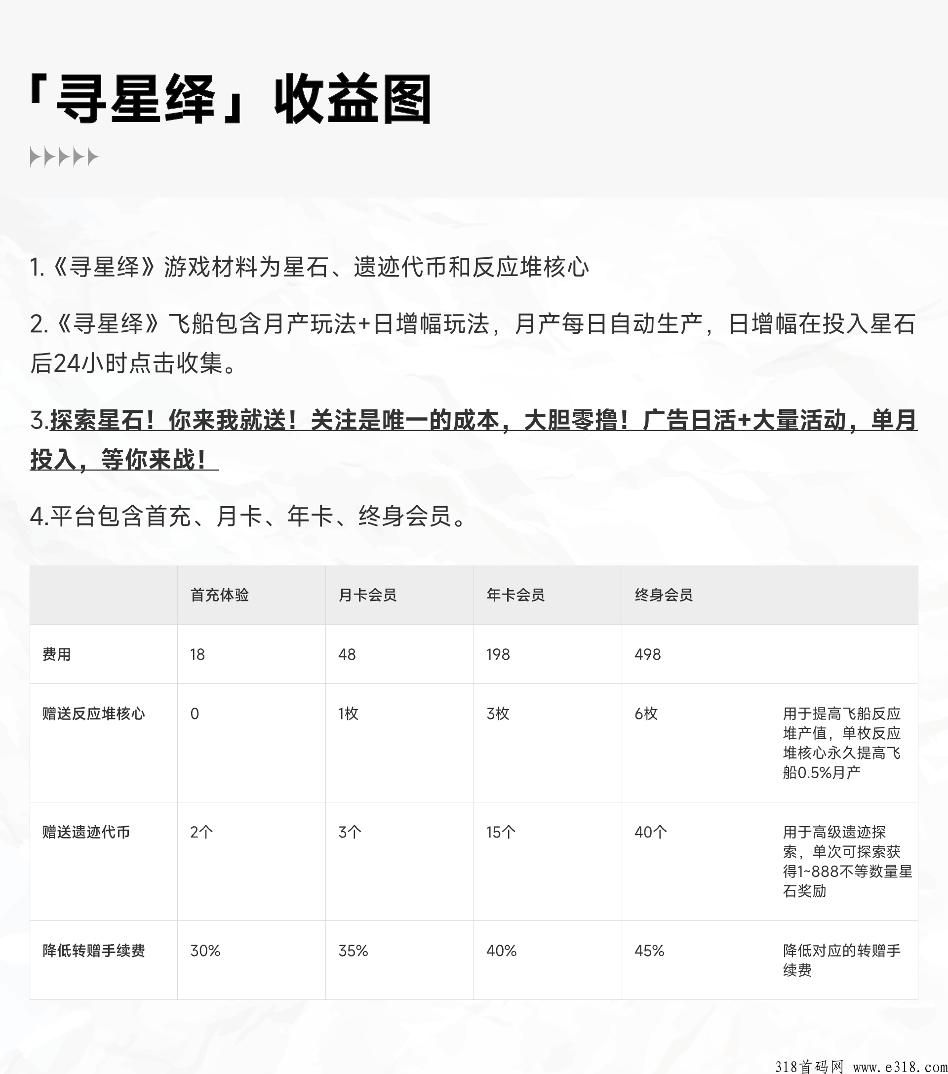 《寻星绎》3月25号-28号公司内部测试,月底白名单测试,4月初上线,融资500W,度娘可查到。门槛低,既可零成本参与,又可进行投姿,实铭认证送体验飞船,首冲18可额外得高级体验飞船,除了单次充值,玩家还可以选择购月卡、季卡或年卡,获取更高的收溢,团队二代收溢,扶持拉满!!!