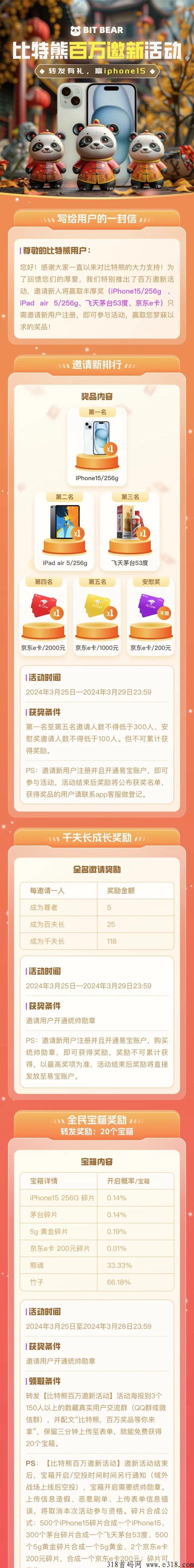 比特熊项目已经测试半个月了,第一批上车的小伙伴已经都吃上肉了,还在观望的小伙伴赶紧上车了,今天完成大更新,上新模块,玩法更丰富,活动期间更是有手机、茅台、京东现金券等等,先到先得,数量有限哦!之前我也已经发布过了玩法及攻略,感兴趣的朋友可以去看看了