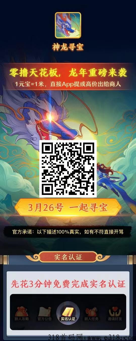 神龙寻宝抢先出首码,3月26日全网首发上线,26类奖励,33种零撸打金玩法,颠覆性创新,所有玩法不收任何费用,每天0撸30分钟随随便便30+,各路大神已开始提前布局,神龙寻宝官方总对接,政策置顶,扶持天花板!