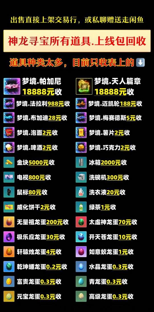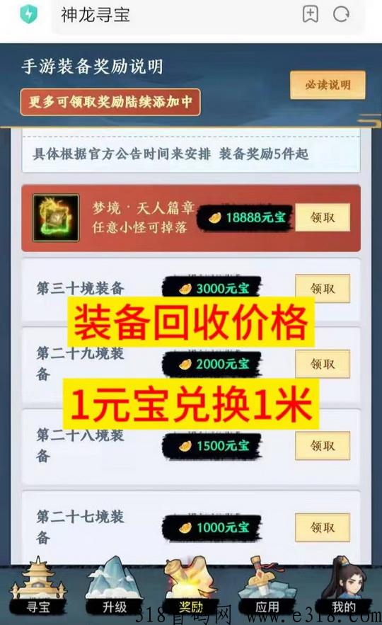 神龙寻宝打金自动回收提现,上线当天新区5倍rmb装备回收+战力奖励、另外实物单件够一元即可自动回收,可零撸,0投资,可推广,团队无限层奖励!