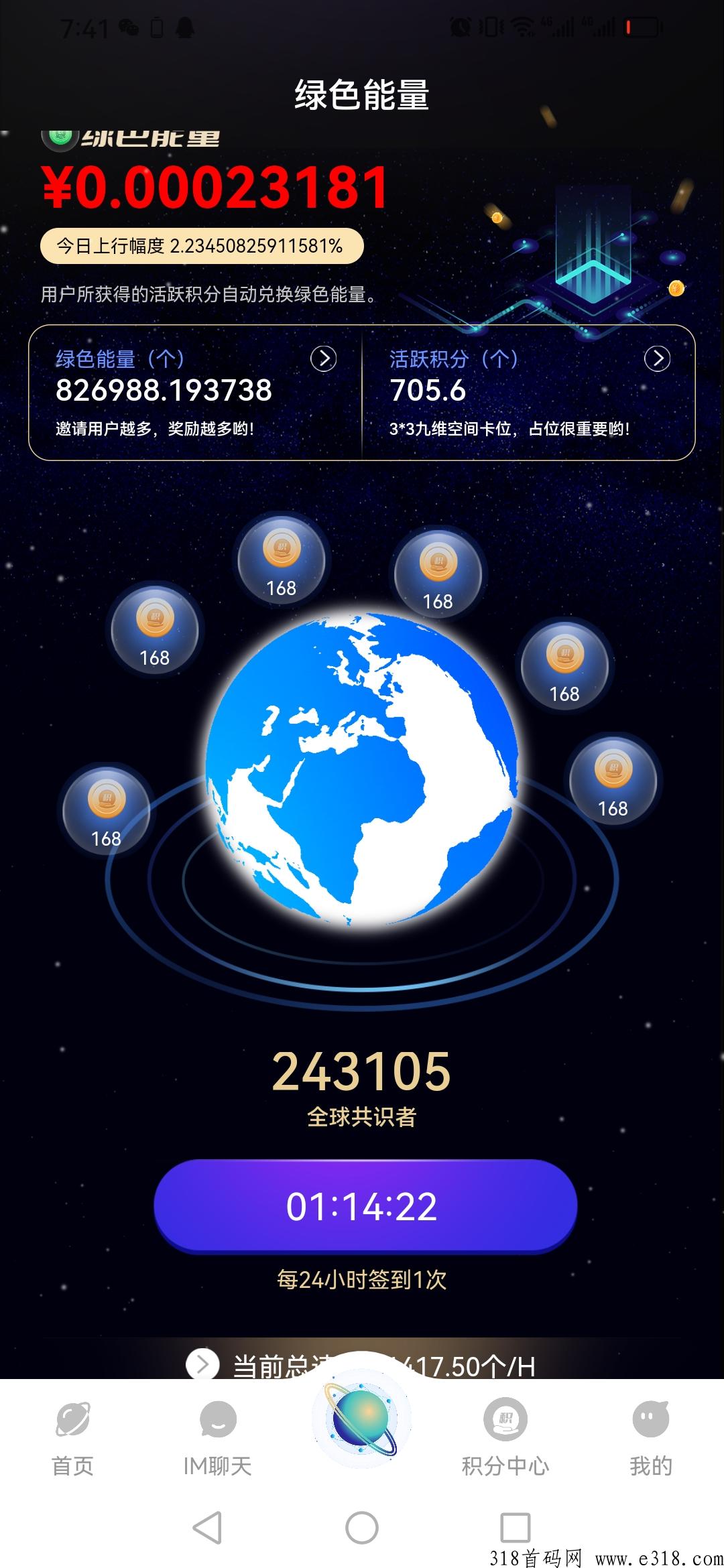 1、App底部点星球,上方点6个圈看6个广告,再签到即可,每24小时启动一次,每小时90能量,24小时就是2160个能量,1个价值0.00017米,能量每天都在增值。