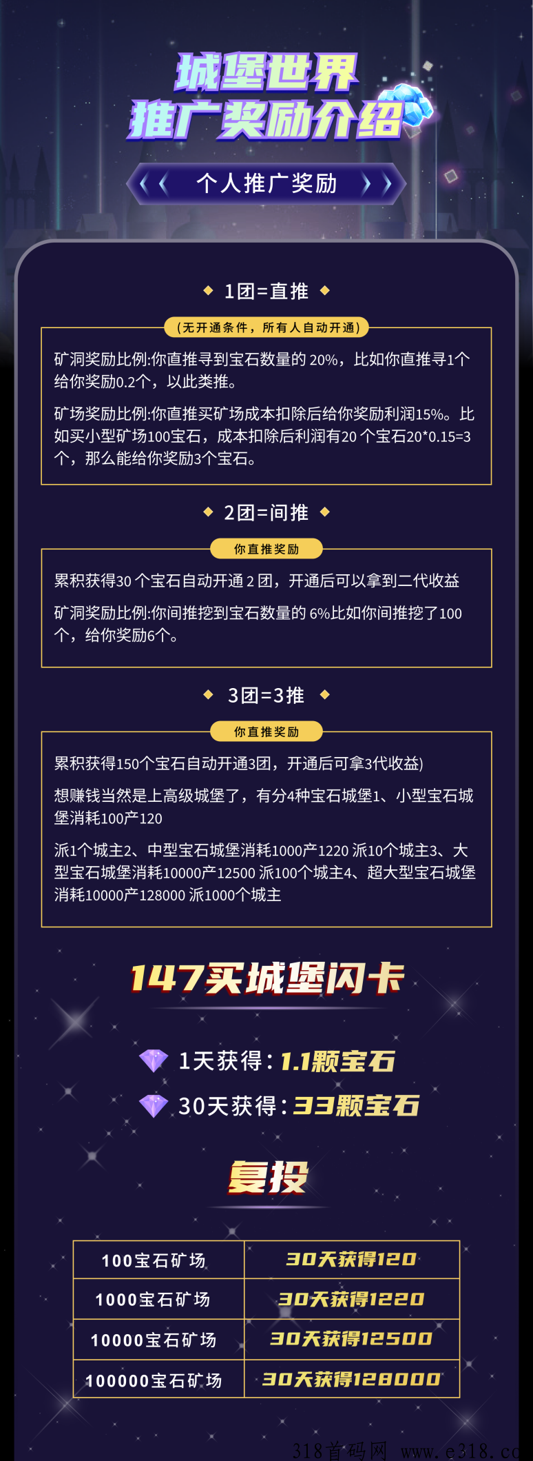 然后大家看一下上面图:不难理解,我们的玩法是147购7个城堡,这是最划算的方式。每天可以获得1.1宝石,一个月可得33颗,每颗约5圆左右。而且这些城主可以永久帮助挖宝石。