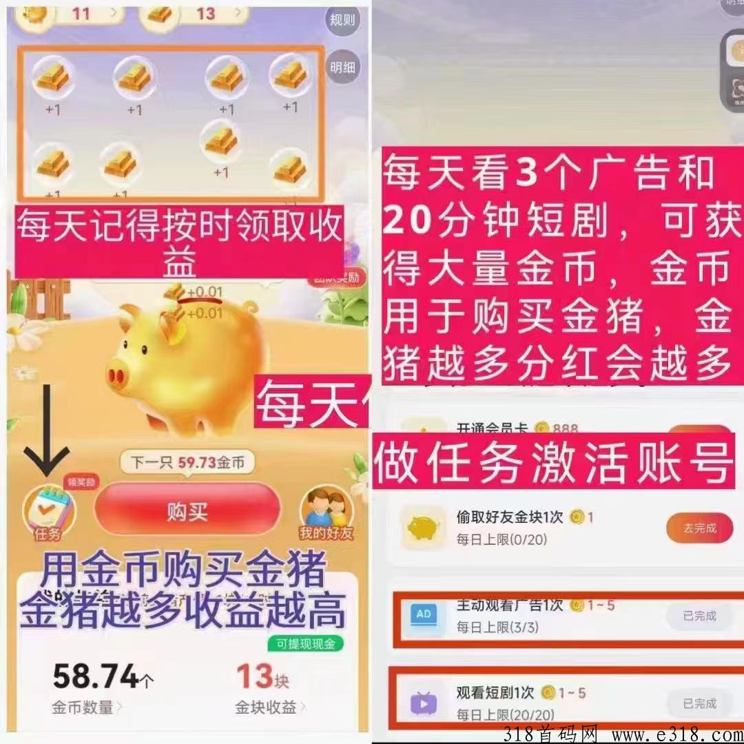 完成每日的任务,获取金币!金币可以兑换金猪,一个月后就是每天67元!