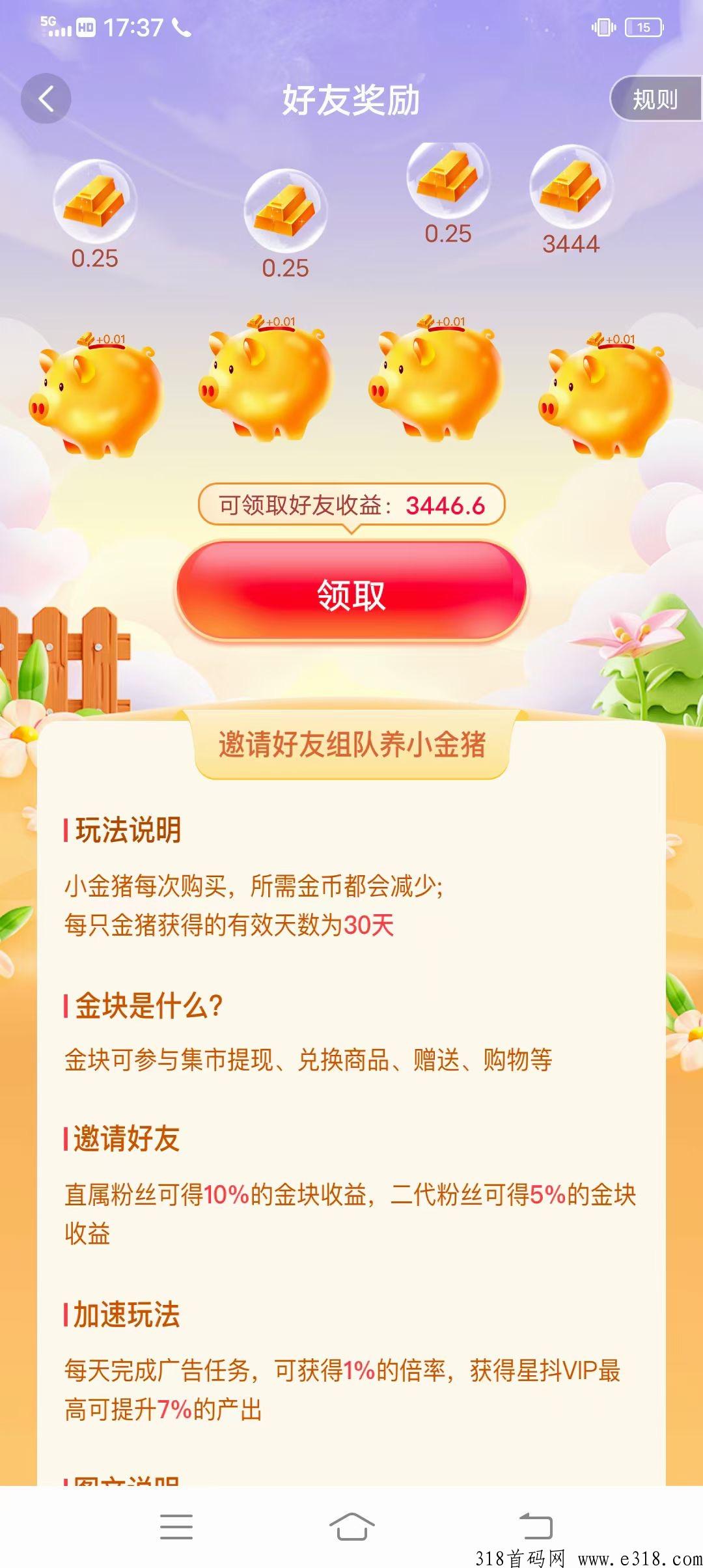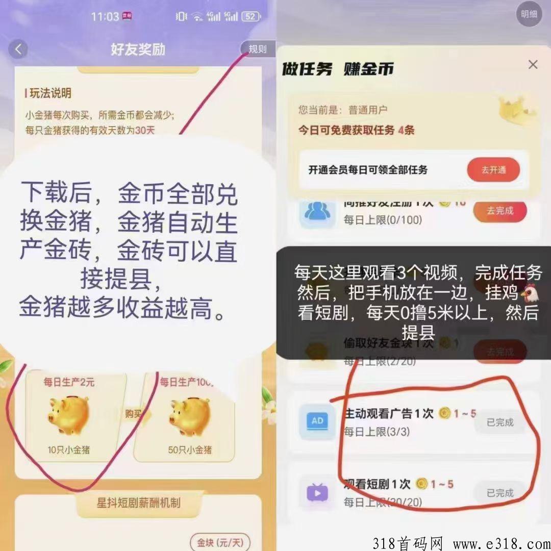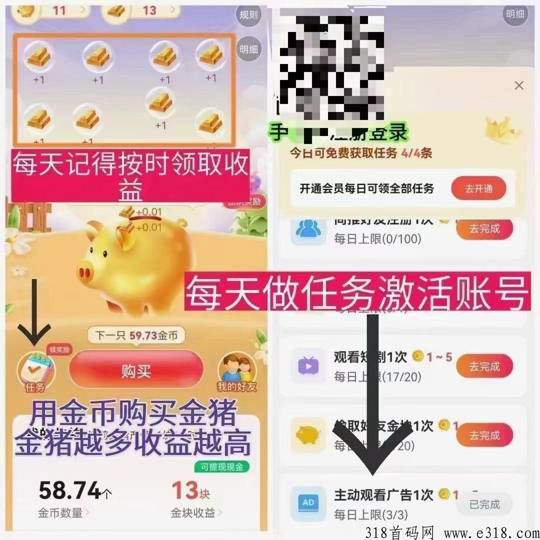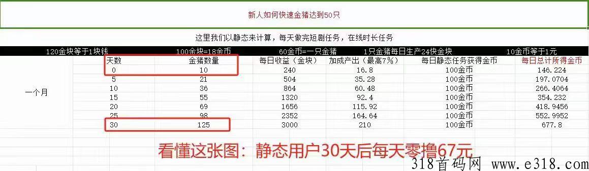 完成每日任务,获取金币。金币兑换金猪一个月后每天67元。