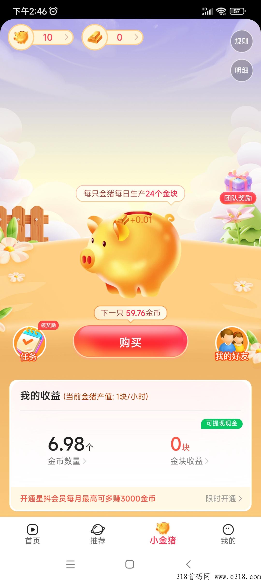 分享星抖短剧给更多的人,组建社区,成为合伙人。3.可以获得多少金块?每天完成上面的任务,随着天数增加,你的金币越多,买的金猪越多,到第30天的时候你的金猪数量会差不多有一百多头,到那个时候,相当于每天有零撸50-60左右!这里说的是单机。