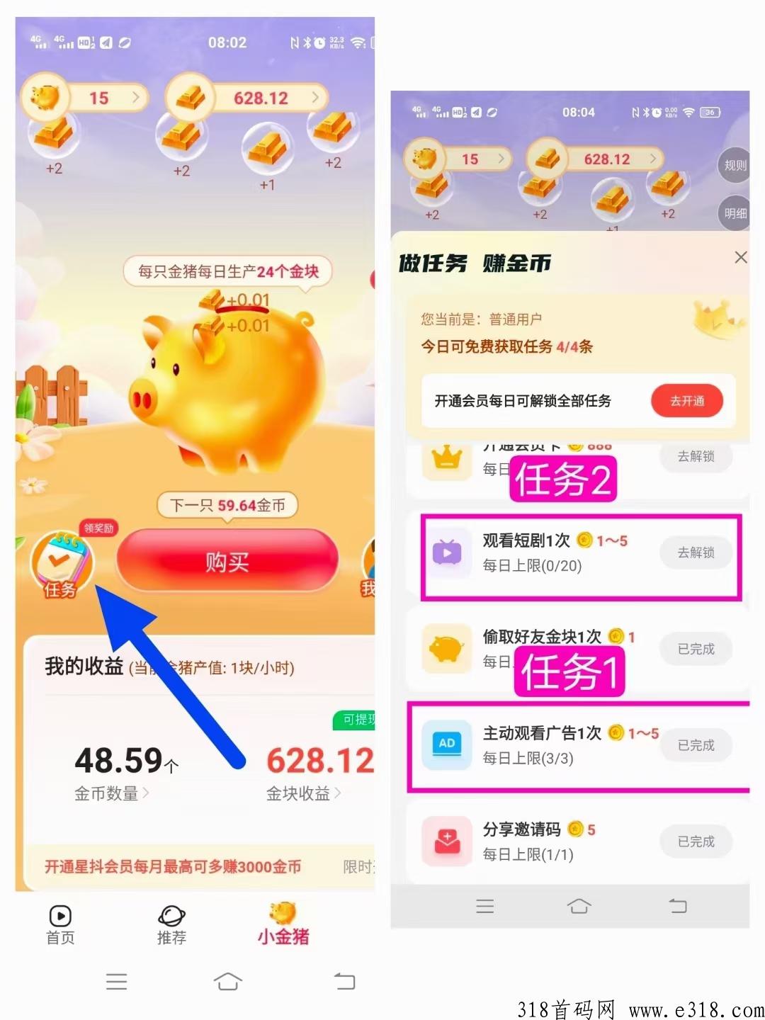 第二步,在“小金猪”游戏界面直接使用送的600金币购买10只小猪,然后就是每天完成这个里面的任务啦!完成的任务越多,收益越大