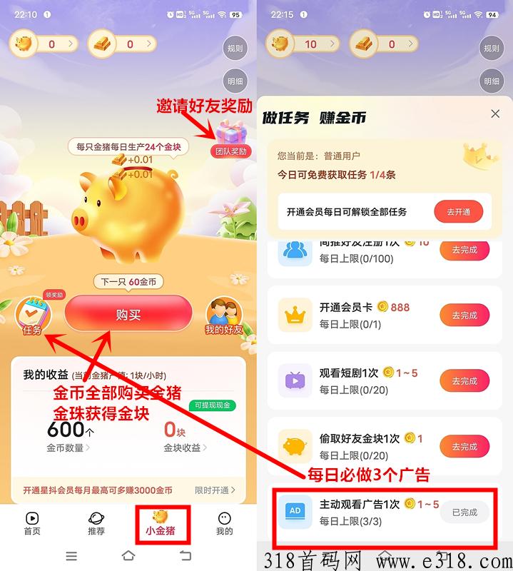 二、小金猪→任务→看广告3个(必做)