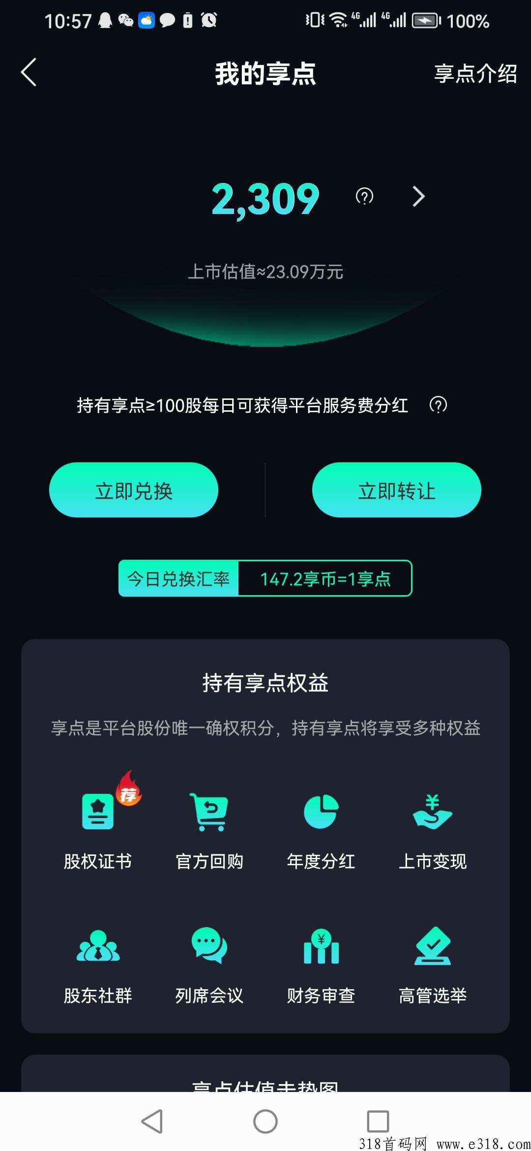 平台将100%手续费每日分给持有享点≥100股的股东,持有享点 (股份)越多,则每日可获得享币**越多!