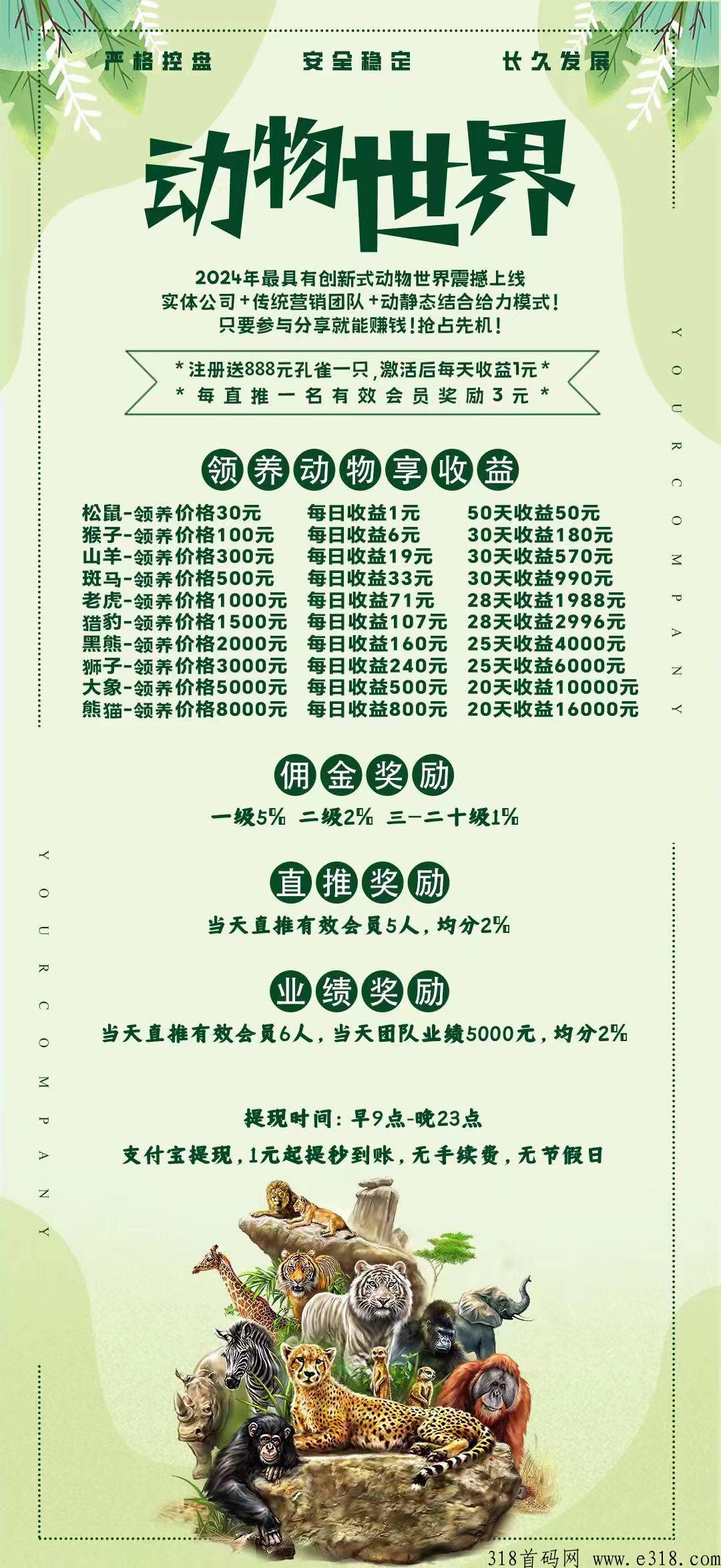 300元产品,日收益20元,每天可以提现20团队领导人驻扎公司,动物乐园是上市公司,4月20日火爆上线!动态1级5%,2级2%.1元起提现秒到账,无手续费