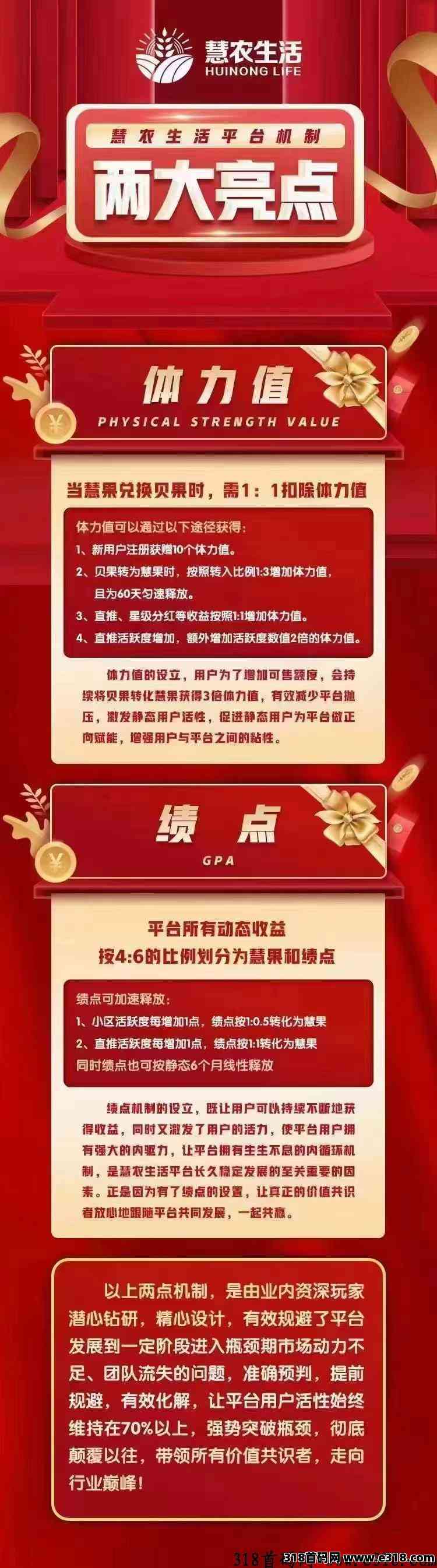 重点,慧农生活,购买299礼包,扶持50!(目前还没有哪个团队明确扶持礼包的!)一个月内复投至8包,每月收益16个慧果,也可继续积攒上100包,收益更多!!!