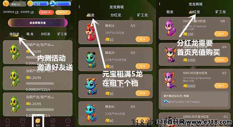 3、租龙:用元宝租龙产更多元宝,L1阶需要租满5只龙,才可以租2级龙,以此类推(卷轴玩法)