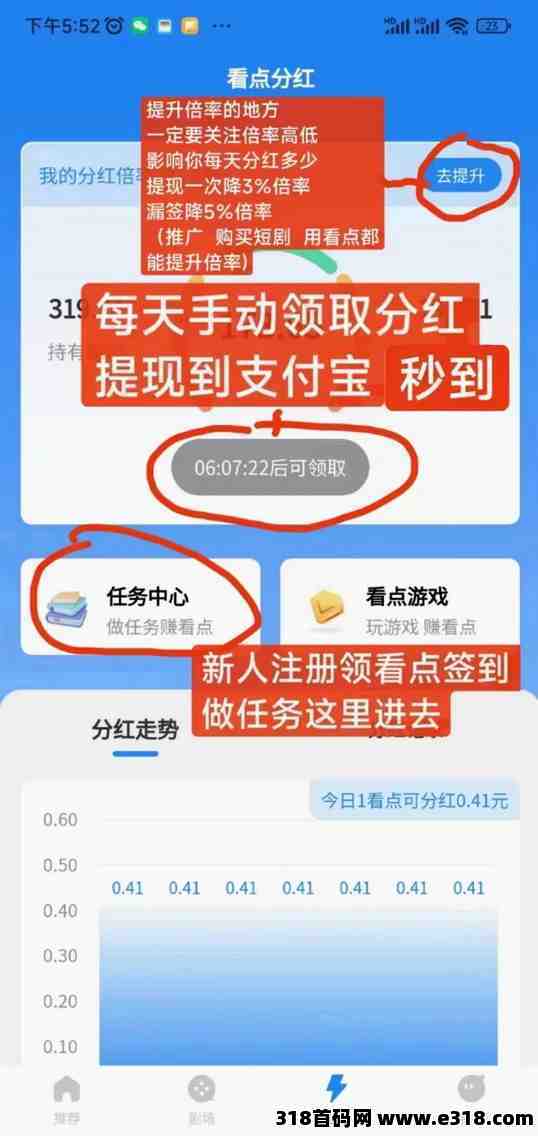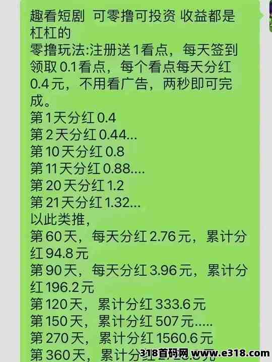日常收益:每个看点每天可以带来0.46元的收益,持有的看点越多,每天可获得的收益也越多。另外趣看短剧官芳包回收“看点”,目前市场价8元左右一个,供不应求,长久稳定的项目,没有那么多套路,非常适合上班族或是空闲的朋友在家看短剧搬砖!