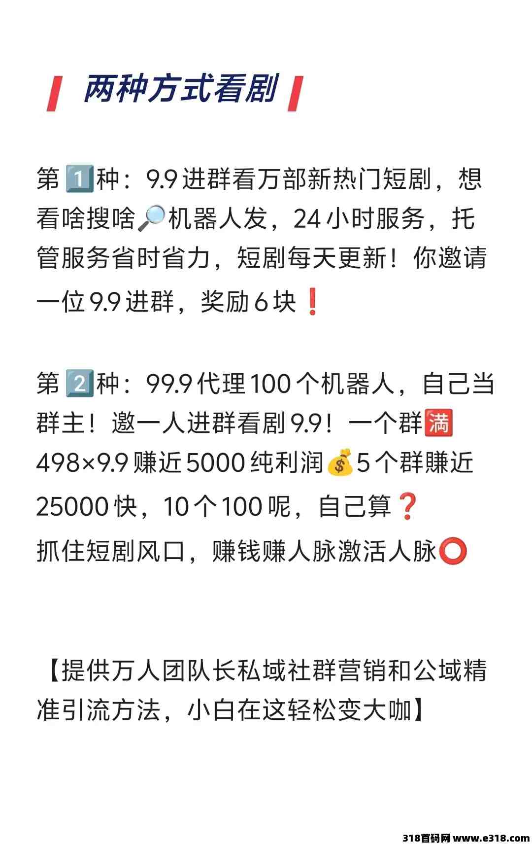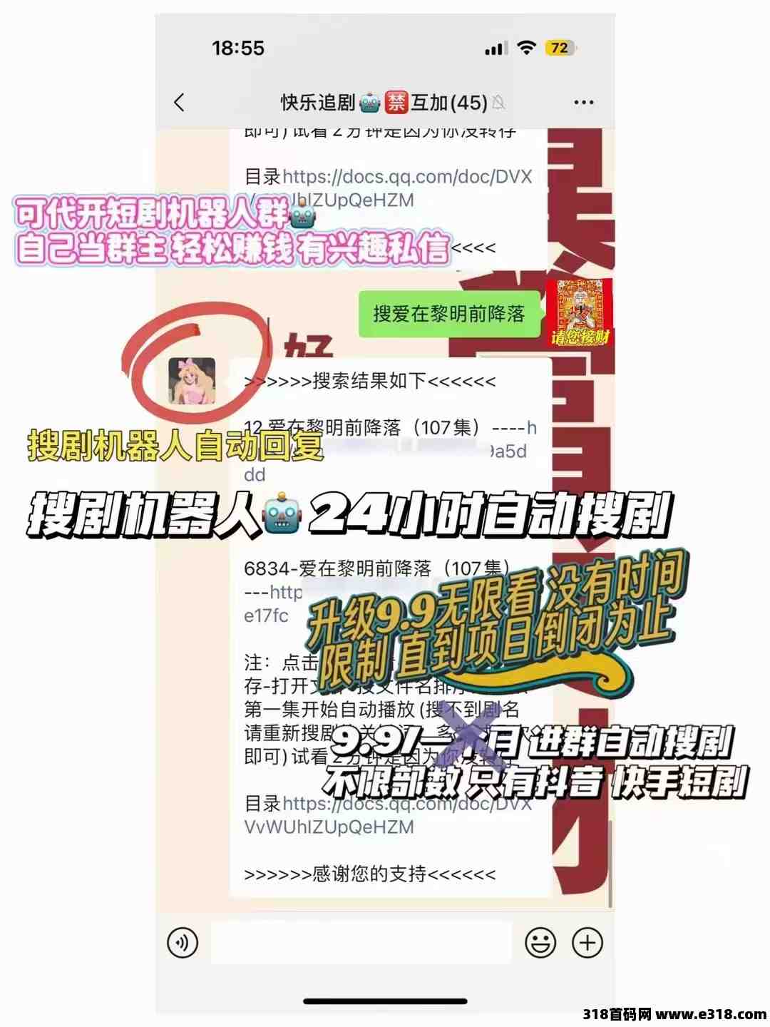 只要你会建微信群,就能赚到短剧推广的红利。短剧社群机器人,将喜欢观看短剧的人拉到一个群里,然后通过指令:搜xxxx,用户即可观看到他们想要的短剧全集。再也不用去抖音快手花几十几百充钱看了