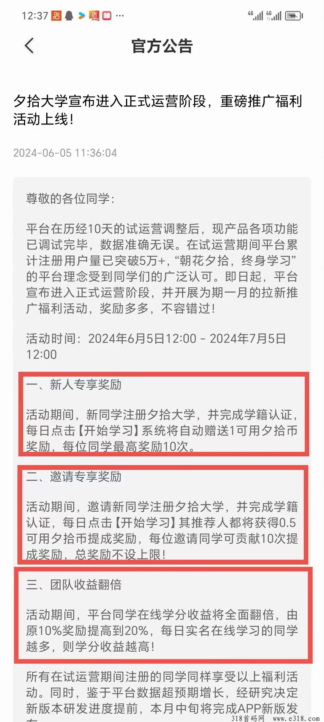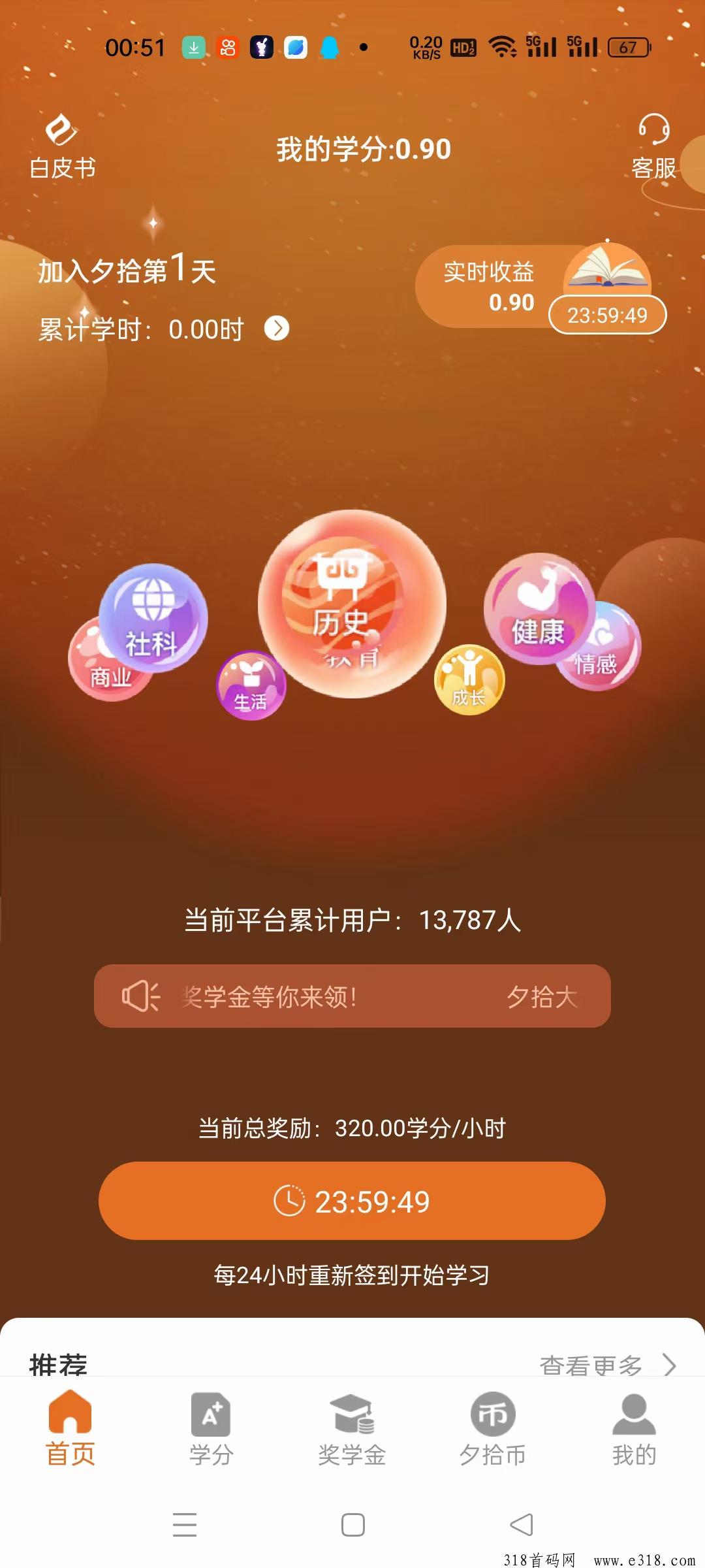 每小时产320学分 10000学分可兑换2枚夕拾币 学分和夕拾币每天涨价 不看广告不做任务《实名认证》每天领一币 领十天价值 15米,推广下级实名认证每天多领0.5米, 每天点击屏幕一下启动即可 每月根据持有夕拾币排名瓜分30万现金红包 一个月一期 转赠获得数量也计入其中 零撸首选