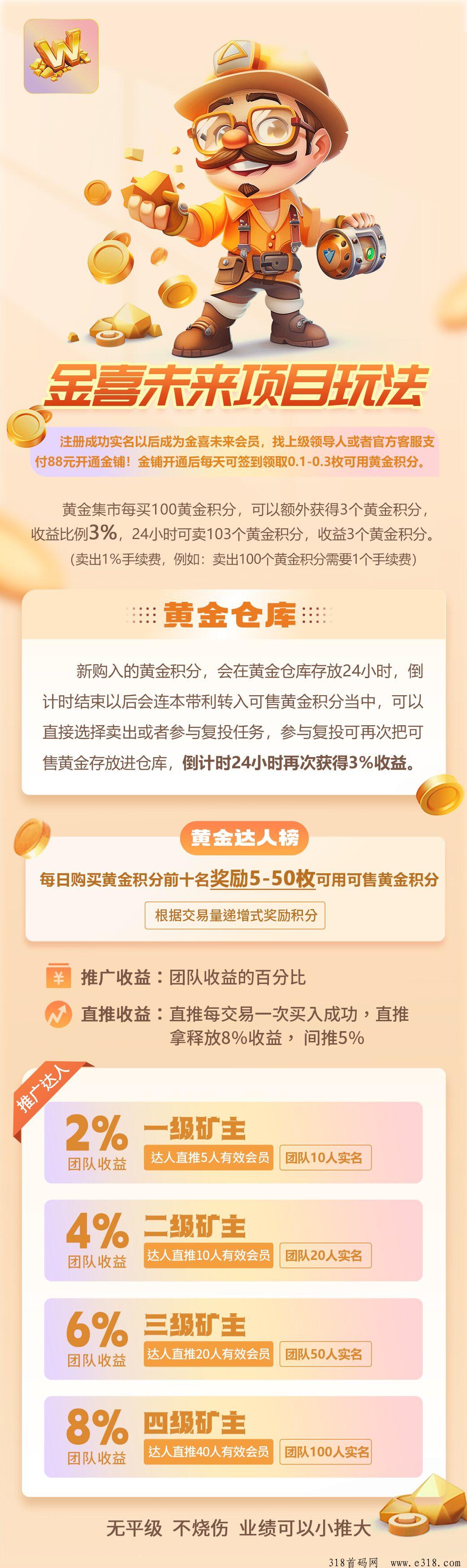 注册成功实名以后成为金喜未来会员,找上级领导人或者官方客服支付88元开通金铺!金铺开通后每天可签到领取0.1-0.3枚可用黄金积分。