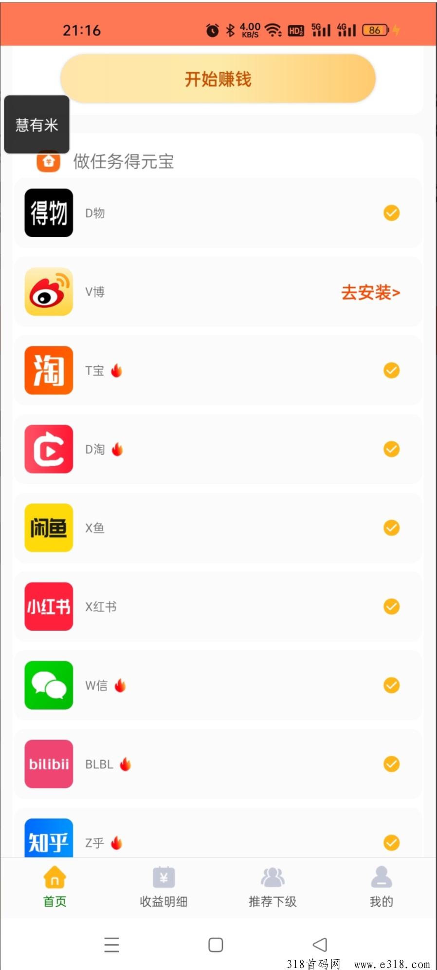 B站、 D音、 K手、 D淘、乎、X 鱼、 W信、 X红书等11个平台自动赚米