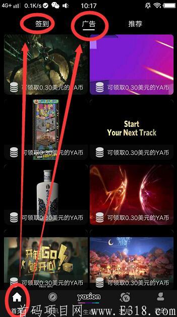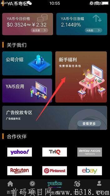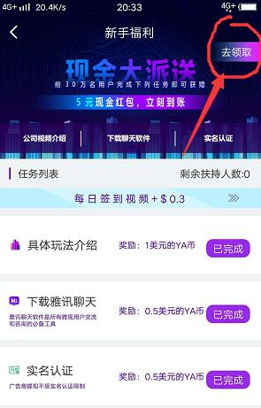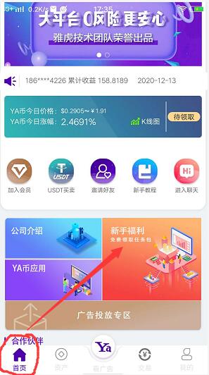 点中间“生态”——点新手福利——下载聊天软件 登录一下——然后 会到雅视APP 点首页上面“看广告”—点签到看3个广告-在点广告领取YA币