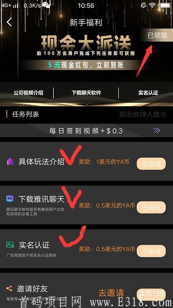 不用投资只需每天签到视频15秒,每天领取2元YA币