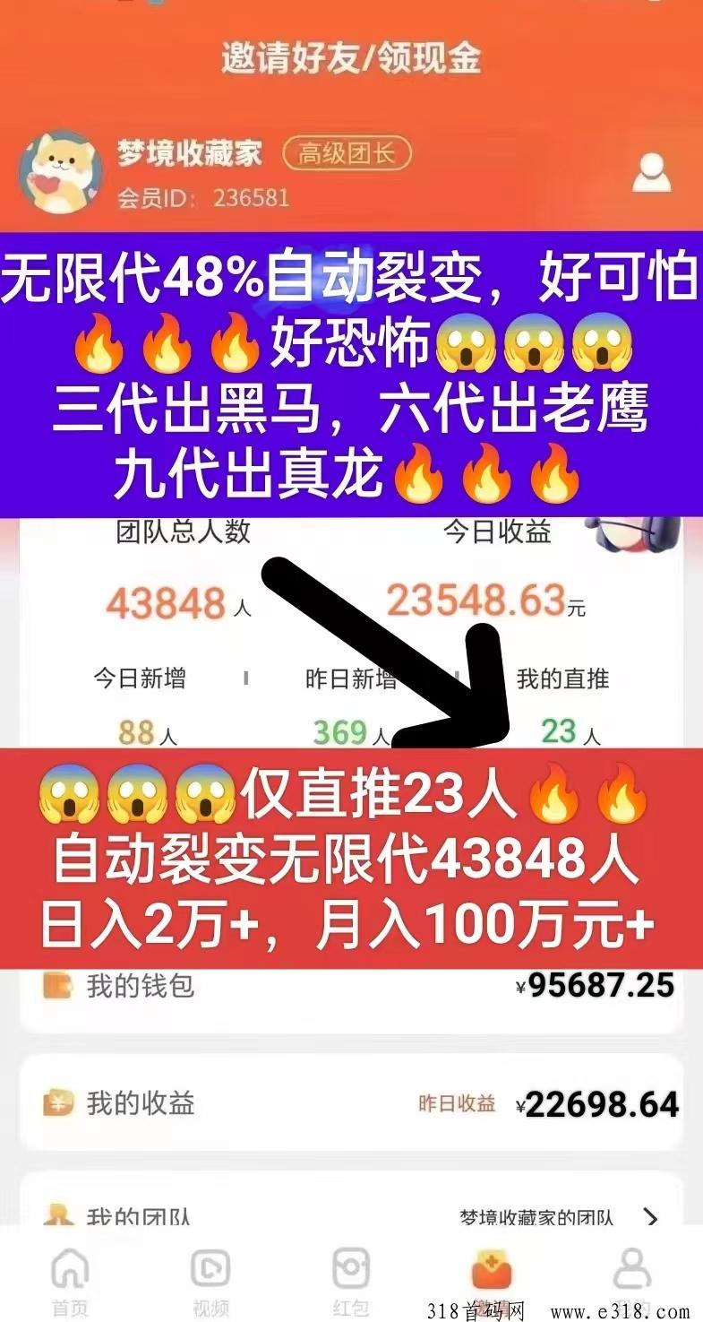 拉一个人得88奖 励+无 限 代48%,邀请20人,即可成为团长,团长有专属推广链 接,开通独立后台,团长每天保底800-1000+无 .限.代48%提成,就是拿无 限.代下级所有人拆讧包金额的48%的提成