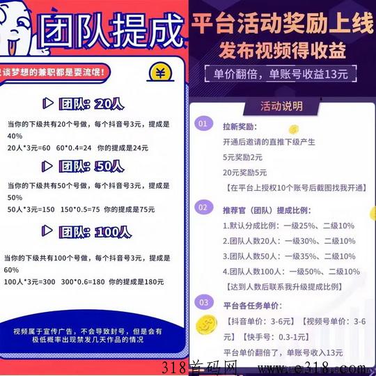 (斗音):发布视频奖励3元~6元!