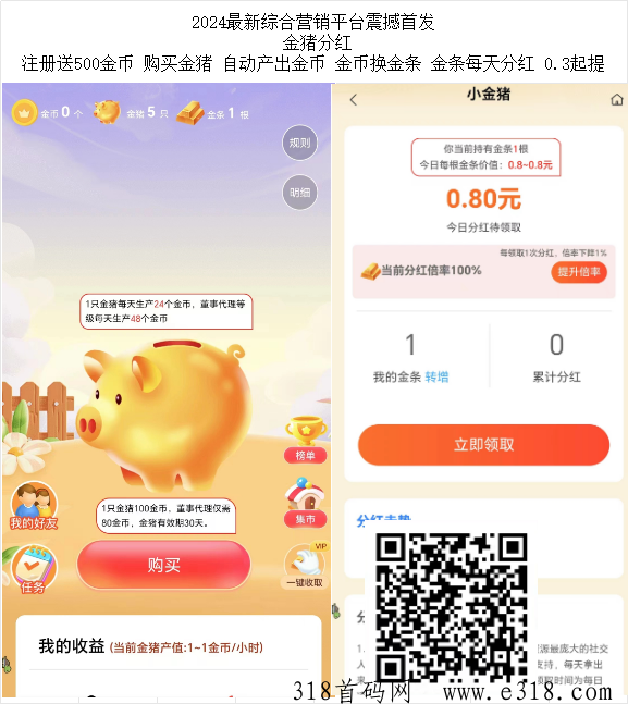 平台亮点:1.注册赠送500金B和一个**金猪(价值1到8元),1000金B兑换一只金猪,永久参与**,每天**无上限,可永久0撸