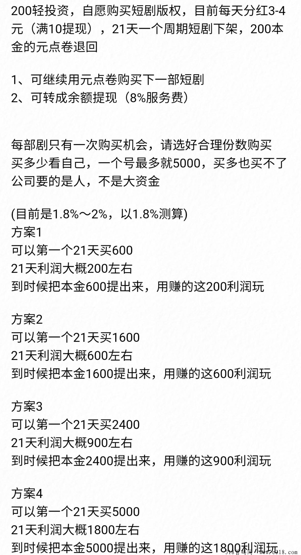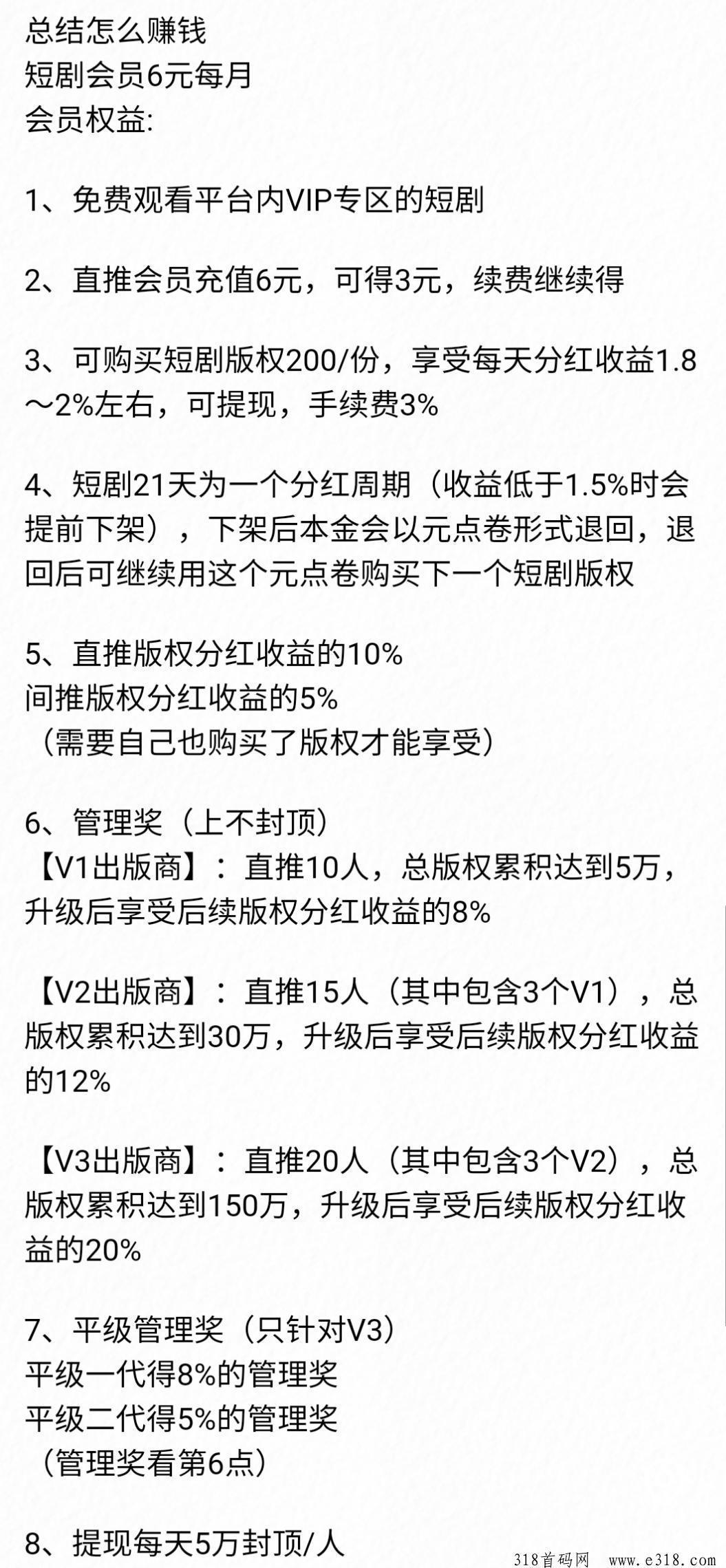 开通6元会员后就可以进群了,可以免费观看平台内VIP专区的短剧 200轻投资,自愿购买短剧版权,目前每天分闰3-4元(满10提现),21天一个周期短剧下架,200本金的元点卷退回 1、可继续用元点卷购买下一部短剧 2、可转成余额提现 (8%服务费)