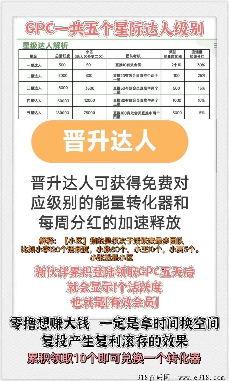 推广收溢:分享获得直推每天产出数量10%GPC加速释放和20点能量值