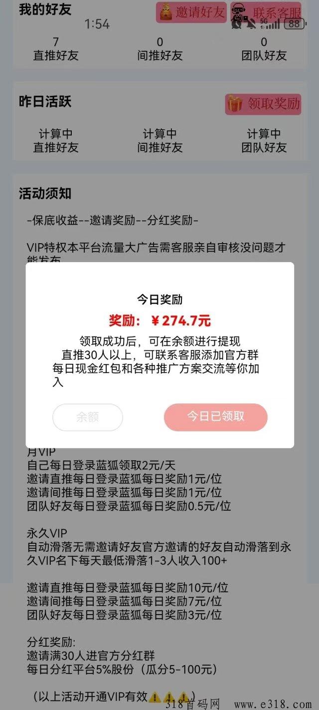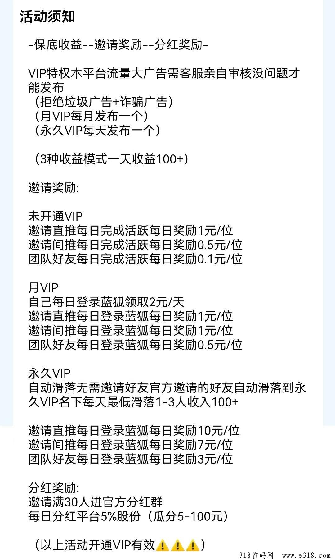 蓝狐首码,每天登录领取2米,下级活跃芬宏