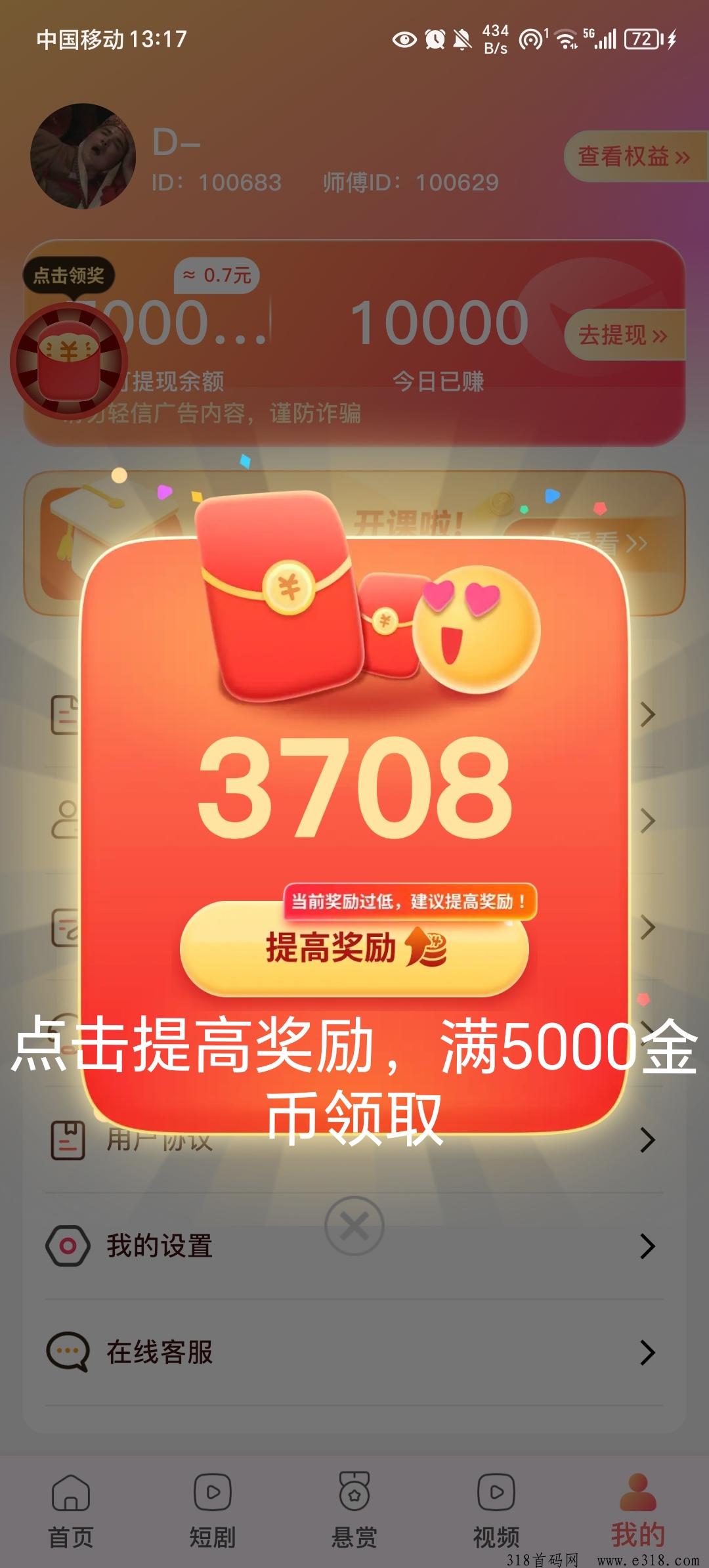 七夜短剧,零撸短剧平台(就是看广告),里面内置悬赏任务和其他同款app,与尚玩,玩赚差不多