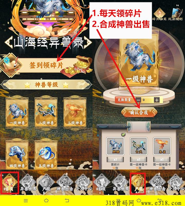 一、注册免费送盲盒(初级、中级、高级异兽)每天签到领取碎片
