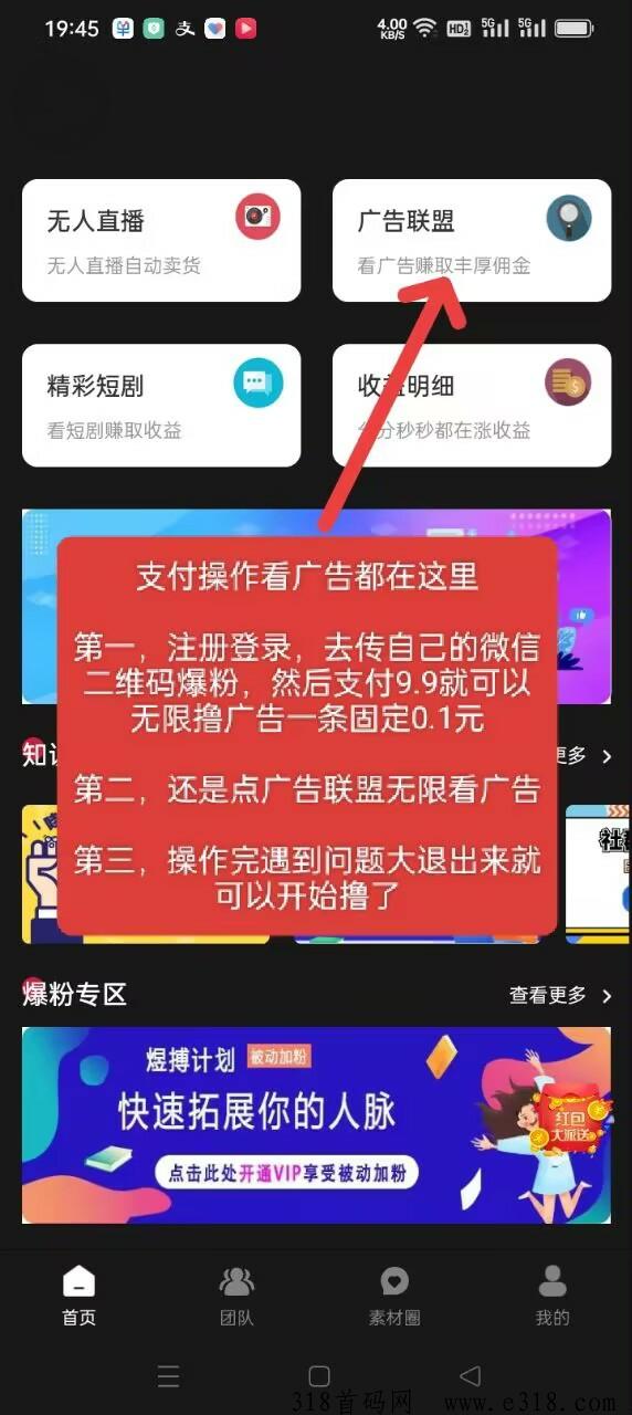 用户首页右上角点广告联盟,然后上传自己加粉二维码支付,就可以无限看广告