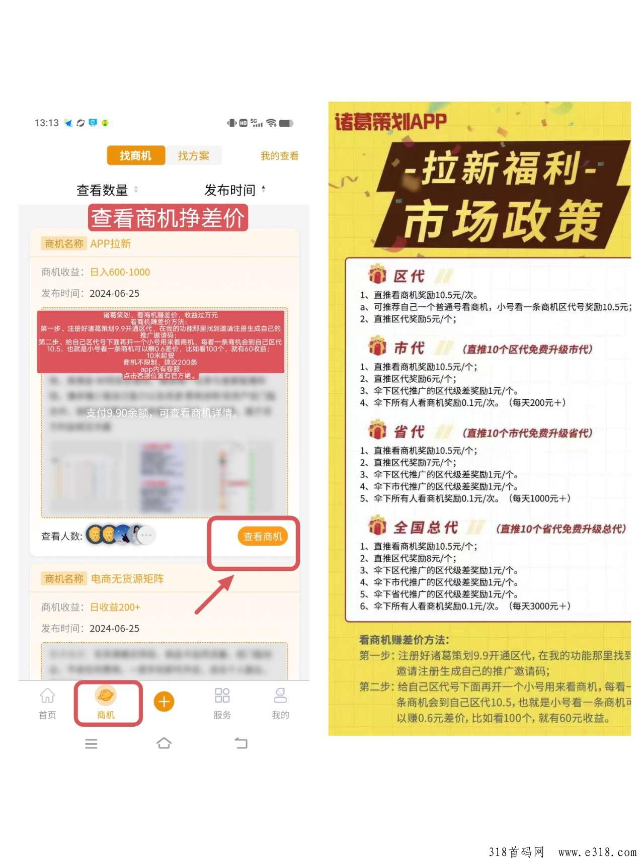 第二步、给自己区代号下面再开一个小号用来看商机,每看一条商机会到自己区代10.5,也就是小号看一条商机可以赚0.6差价,比如看100个,就有60收益;