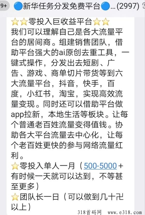 | 免责声明:合作之前建议签订合同,318首码网作为信息共享平台无法对信息的真实性及准确性做出判断,不承担任何财产损失和法律责任,若您不同意该提示,请关闭网页且不要在本站拓展任何合作,否则造成的任何损失由您个人承担。 | |