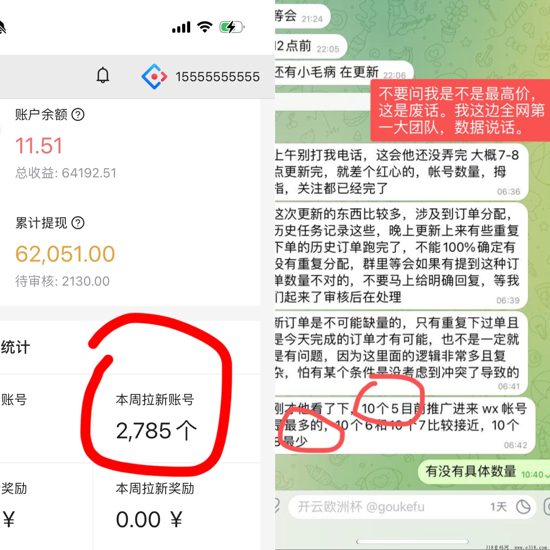 ②拉新奖励:你的直推,挂一个号,这个号点赞+关注到50单,你就进账2块,100个号就是200进账,自动进账