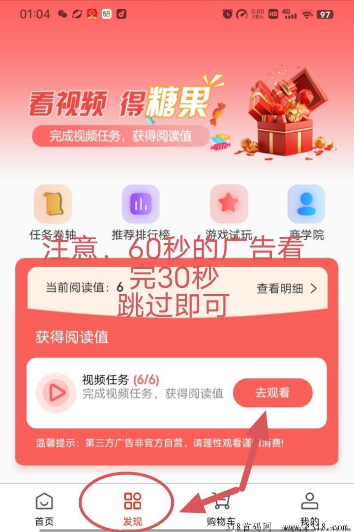 4每天观看6个广告,任务简单(60秒的长广告看完30秒,点击跳过即可!)