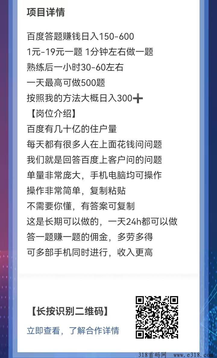 每天都有很多人在上面花钱问问题我们就是回答百度上客户问的问题单量非常庞大,手机电脑均可操作操作非常简单,复制粘贴不需要你懂,有答案可复制