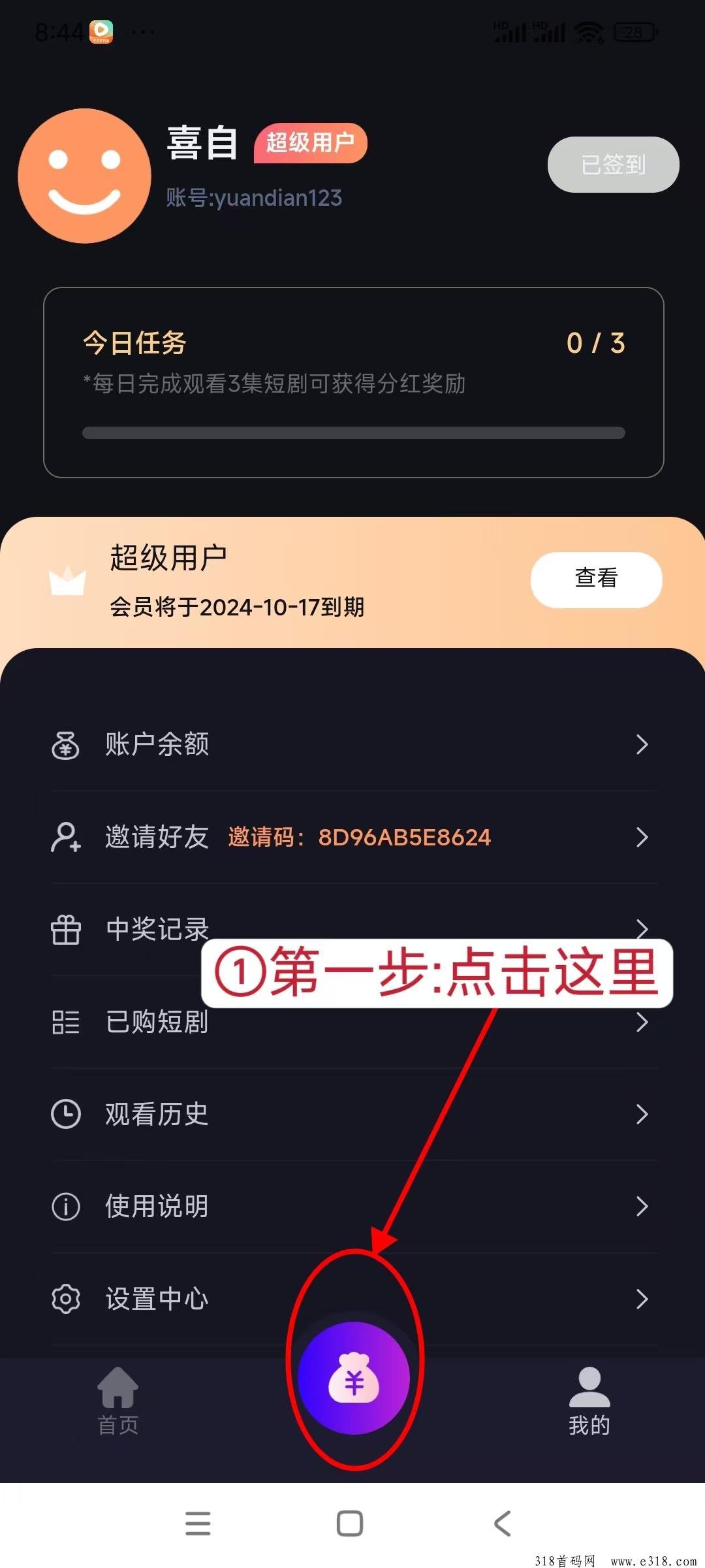 三、首页→随机观看一个短剧3集(任务条满100%)→点击签到(享每天**)
