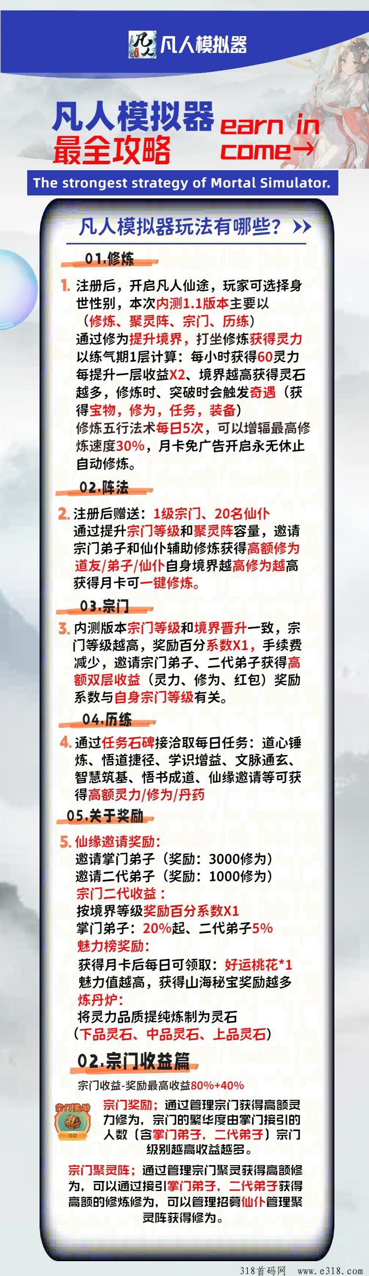 游戏内测送五大福利:万元双榜活动,宗门现金奖励,宗门邀请奖励,首码活动(活动上线7-15天)**万元!?升级到结丹期,即可**公司5%广告收益!?快上车来吃肉,灵石可回收,灵气可买修为,修为提升境界!?提现秒到微信