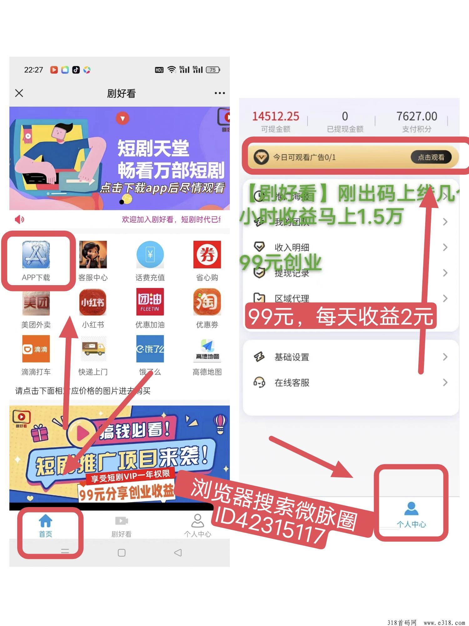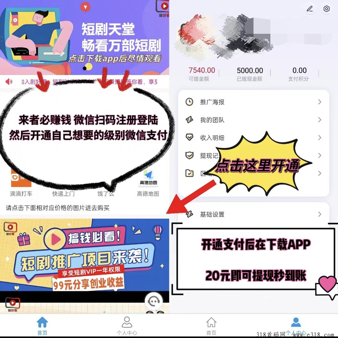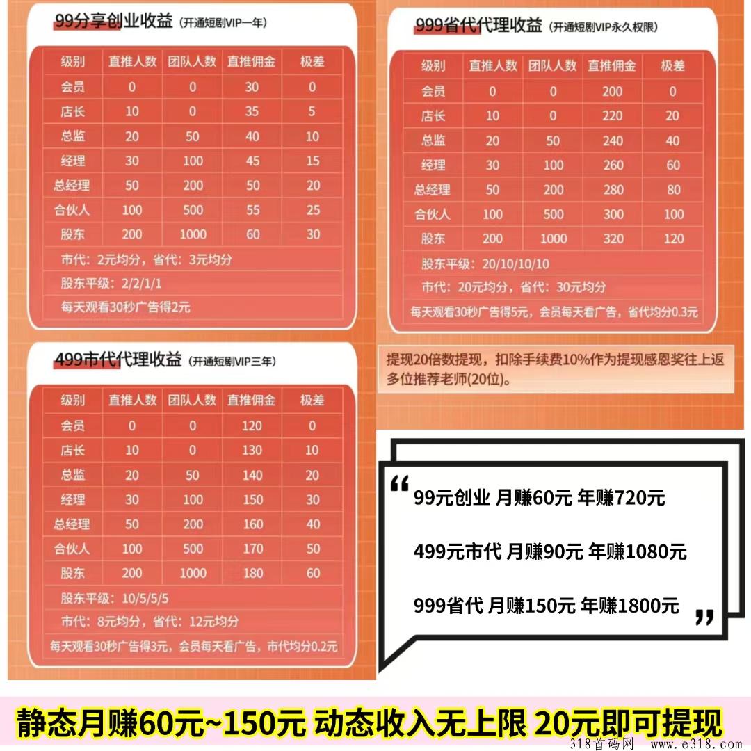 低门槛创业99获得短剧年卡会员,免费看短剧的同时,分享赚米拿管道收益!