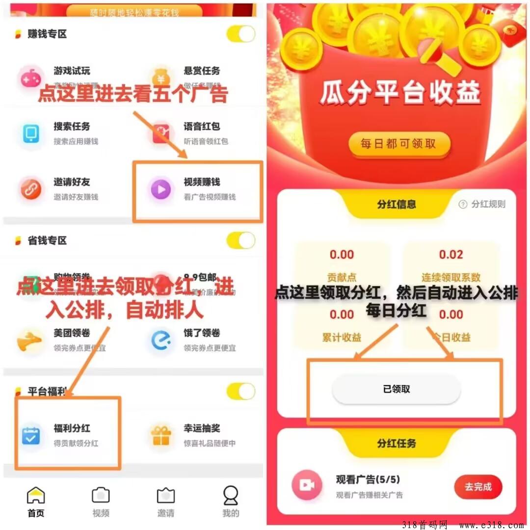 注册 看5个广告 然后点平台福利** 领取就进公排了