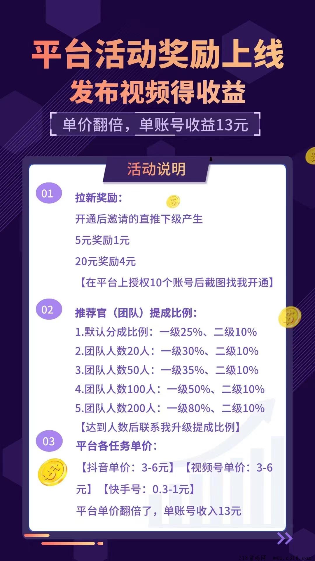 一个任务几分钟完成,不看播放量、不看粉丝量、不看实名,只要按要求发了就有收益的